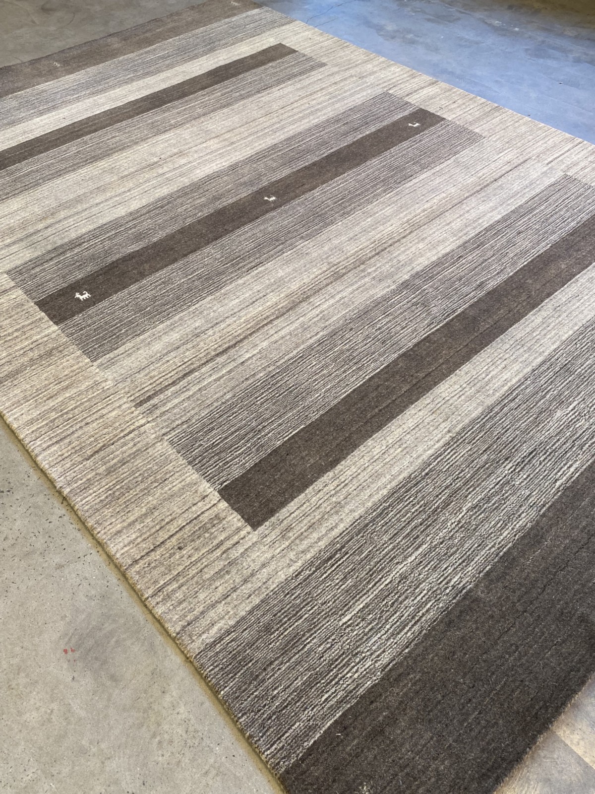 WOOL PILE. HANDMADE LOOM KNOT. PICTORIAL PANELLED DESIGN WITH INTRICATE GOAT & TREE OF LIFE MOTIFS WITHIN A BROWN & CREAM BACKGROUND.