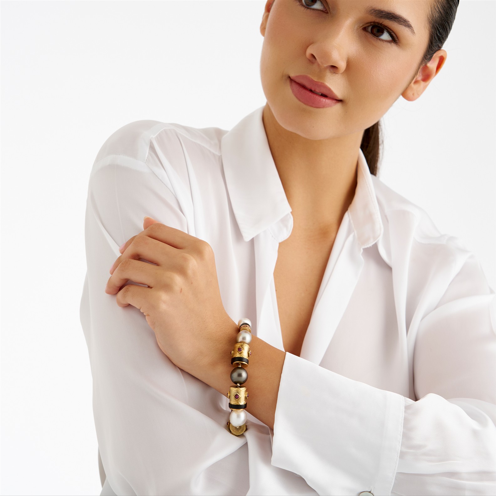 Designed as a line of decorative barrels pavé-set with cabochon and circular-cut rubies between gold and wooden rondels alternated with semi baroque to baroque South Sea pearls, completed by ruby set ornate clasp, mounted in 18ct gold, length 215mm, gross weight approximately 59.7 grams.