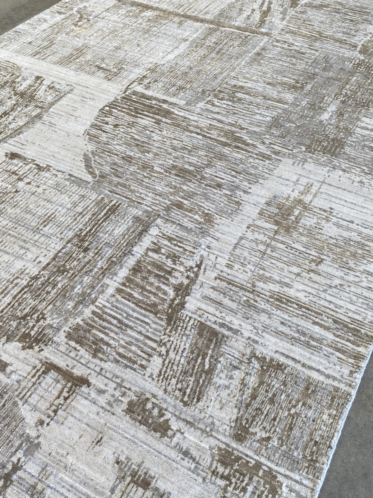 WOOL & BAMBOO SILK FIBRES WITH MODERN DESIGN OF GLACIER DISTRESSED LOOK WITH HAND EMBOSSED PILE LINEAR PATTERNS. THE ENTIRE IN SHADES OF CREAM, LIGHT GREY & CARAMEL.