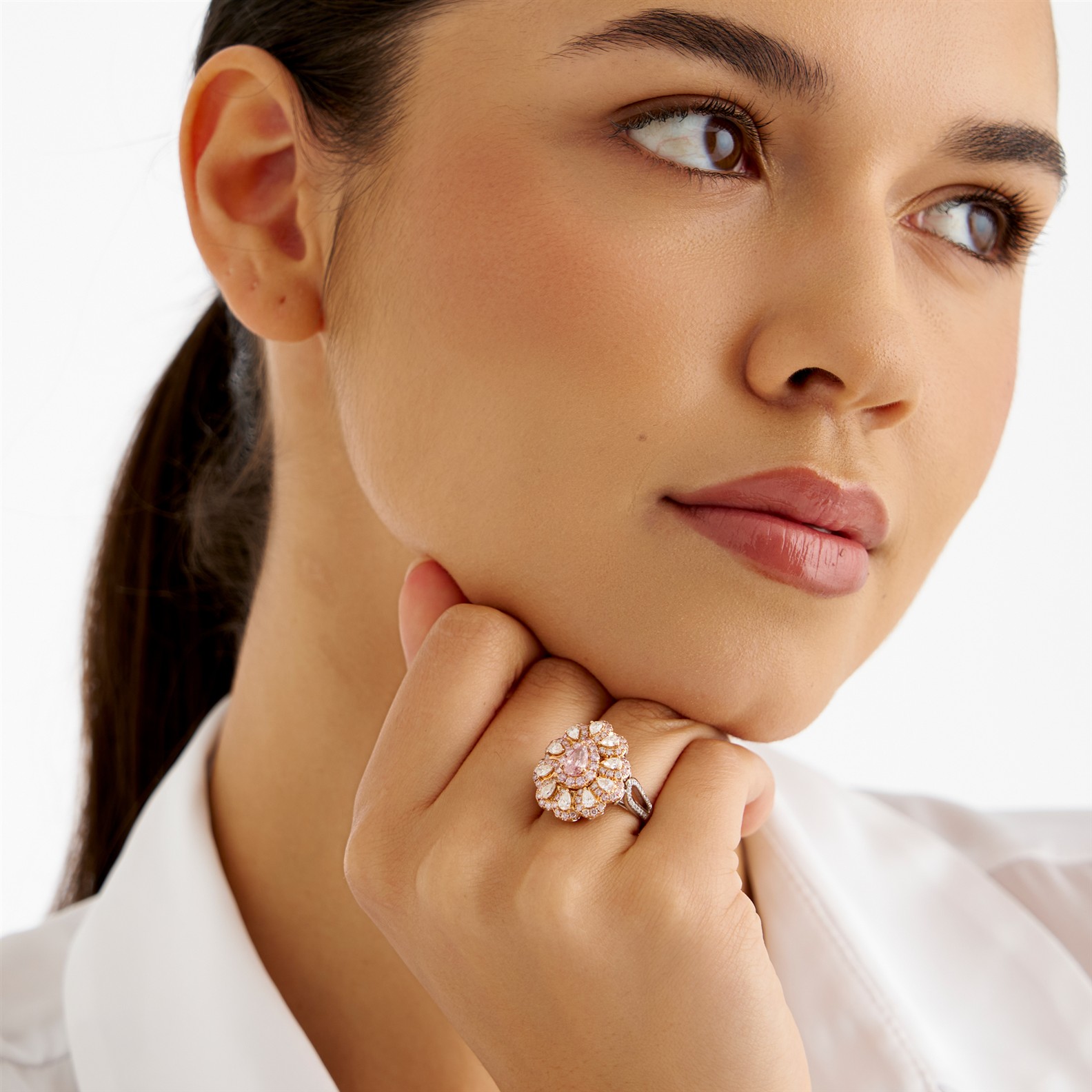 Of cluster design, centring a claw-set pear modified brilliant-cut fancy intense pink diamond weighing 0.53 carats, framed by a halo of fancy light pink brilliant-cut diamonds further bordered by a line of near colourless pear-shaped diamonds framed by pink diamonds, between openwork shoulders pavé-set with near colourless brilliant-cut diamonds, the near colourless and fancy light pink diamonds together weighing 0.88 carats and 0.84 carats respectively, mounted in platinum and 18ct gold, ring size L, gross weight approximately 10.0 grams.