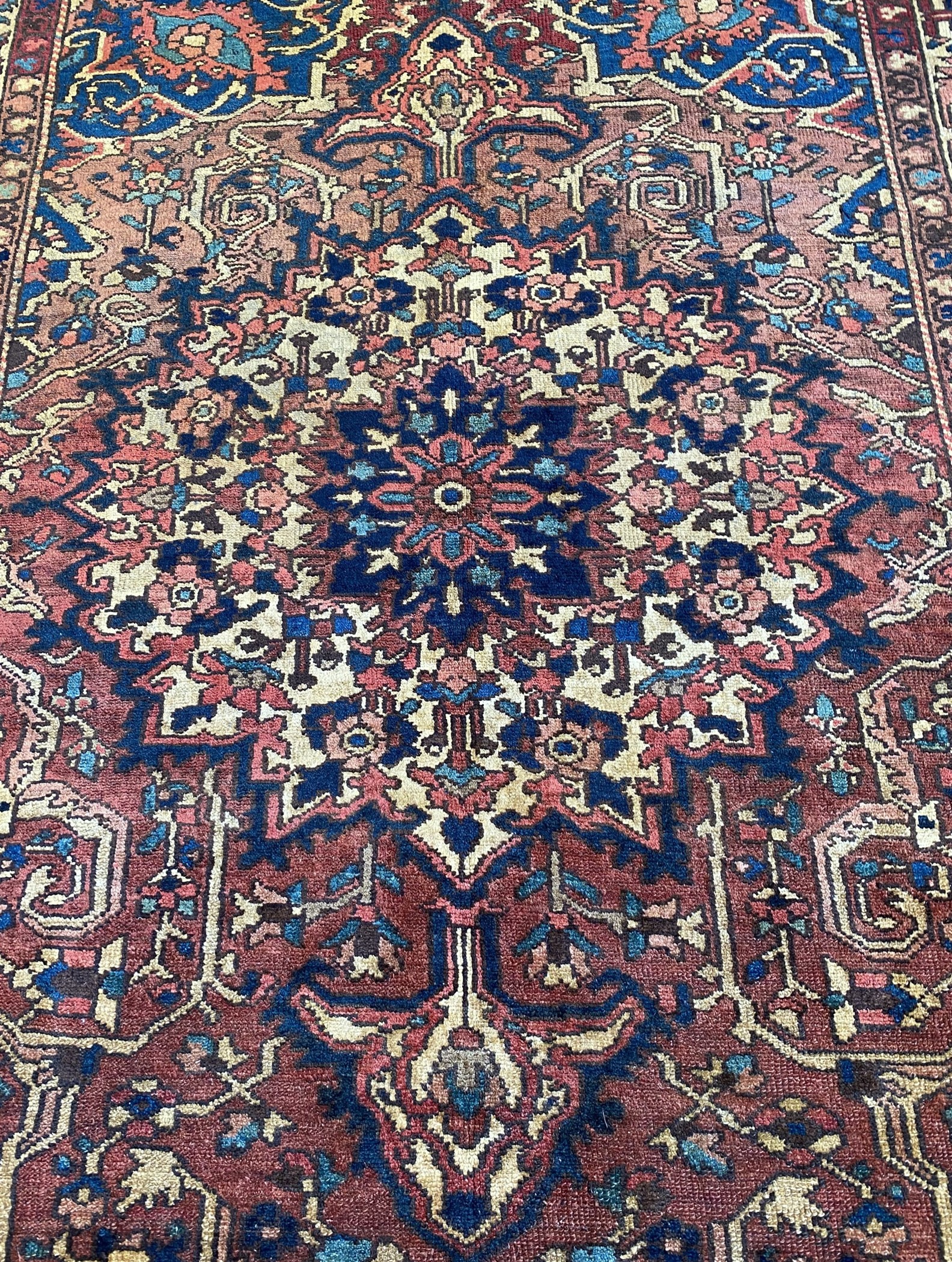 WOOLLEN PILE & VEGETABLE DYES. HAND-KNOTTED WEAVE FROM THE SOUTHERN CHAHARMAHAL & BAKHTIARI PROVINCE WITH NOMADIC DESIGN OF DOUBLE DOMINANT BOLD MEDALLIONS & QUARTERED CORNER MEDALLIONS IN A MADDER-TONED FIELD OF RAMBLING VINES & FLOWER HEADS. BORDER OF PALMETTES.