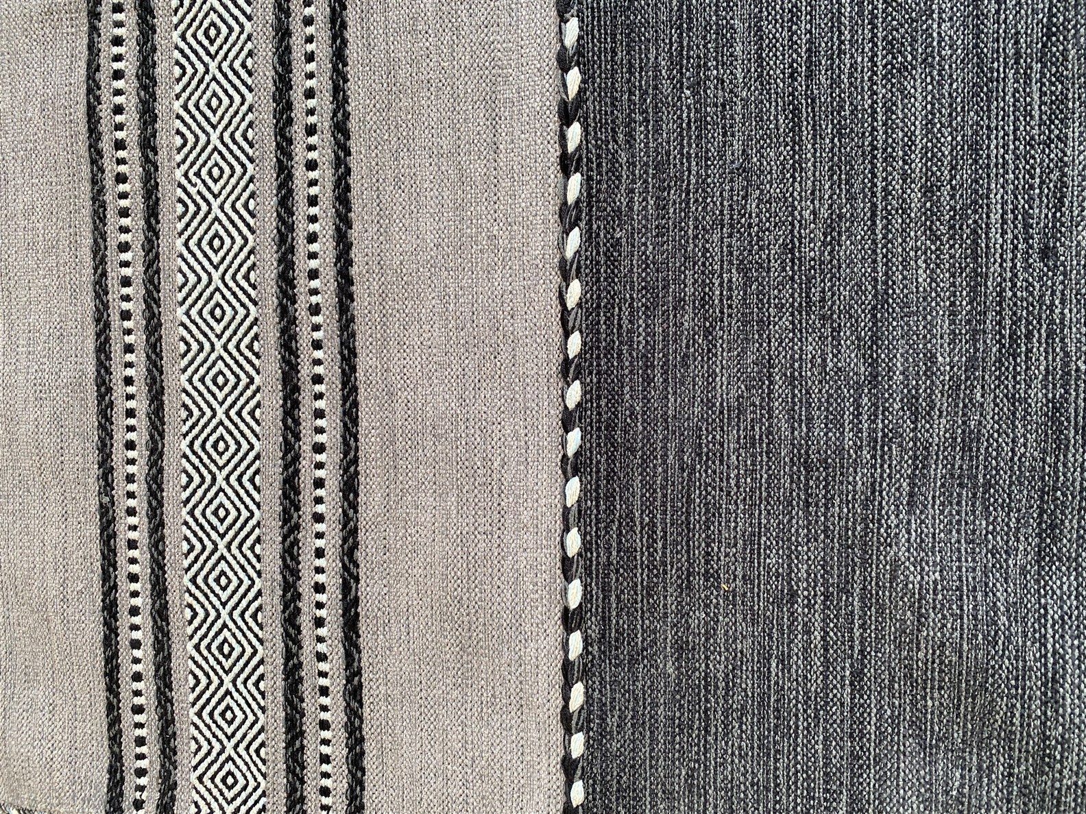 HAND-WOVEN FLATWEAVE IN SHADES OF BLACK & WHITE WITH A BRAIDED SELVEDGE & TASSEL CORNER FRINGES.