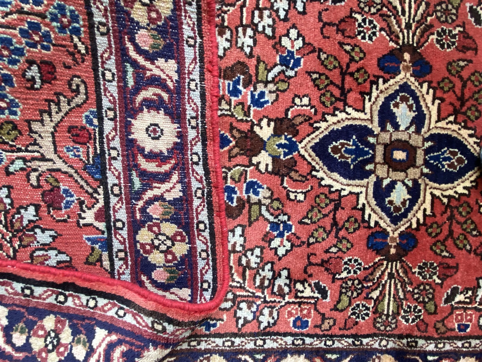 WOOLLEN PILE. HAND-KNOTTED WEAVE FROM THE NORTH-WESTERN AZERBAIJAN PROVINCE WITH TRADITIONAL DESIGN OF A MEDALLION OF FLORAL SPRAYS IN A FIELD OF FLORAL SPRAYS, AND URN BEARING FLORAL FOLIAGE. BORDER OF ROSETTES & LEAF FORMS.