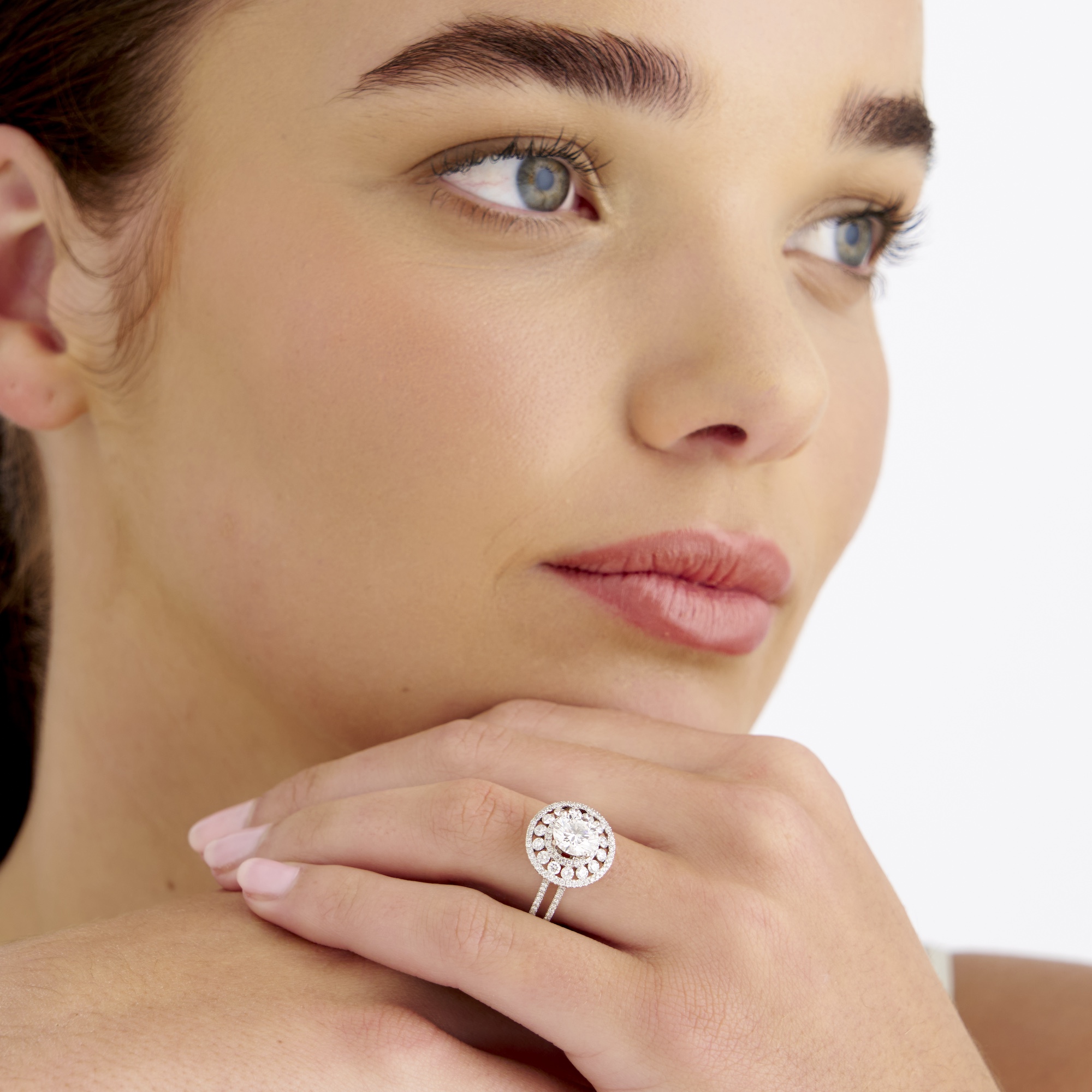 Centring a claw-set round brilliant-cut diamond weighing approximately 1.50 carats, surrounded by a cluster of one hundred and twenty-two round brilliant-cut diamonds set to the halo and split band, the diamonds together weighing approximately 2.67 carats, size P, gross weight approximately 5.4 grams.