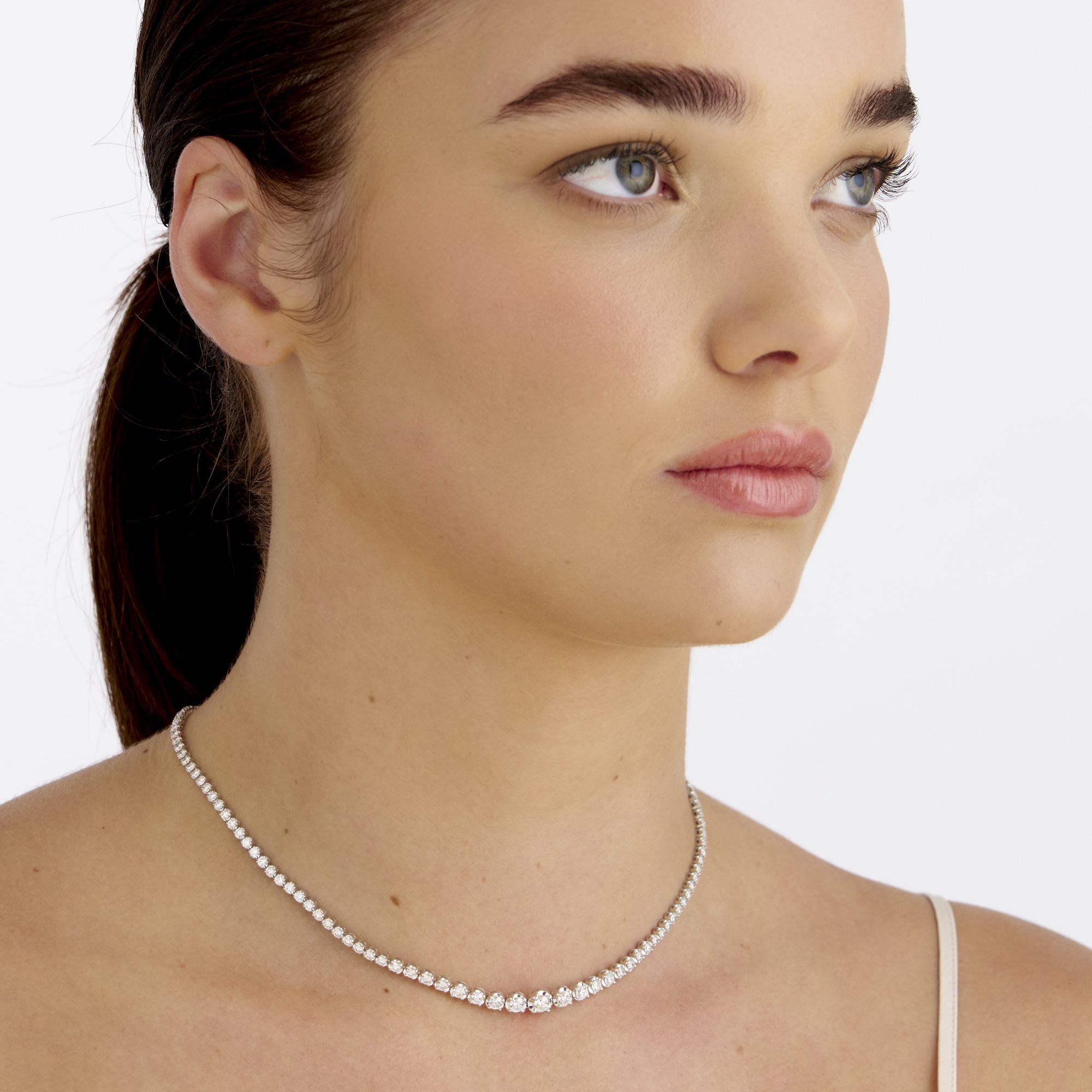 Modelled as a continuous line of one hundred and twenty-six graduated illusion claw-set round brilliant cut diamonds together weighing approximately 7.02 carats, completed by a concealed box clasp, length 400mm, gross weight approximately 15.05 grams.
