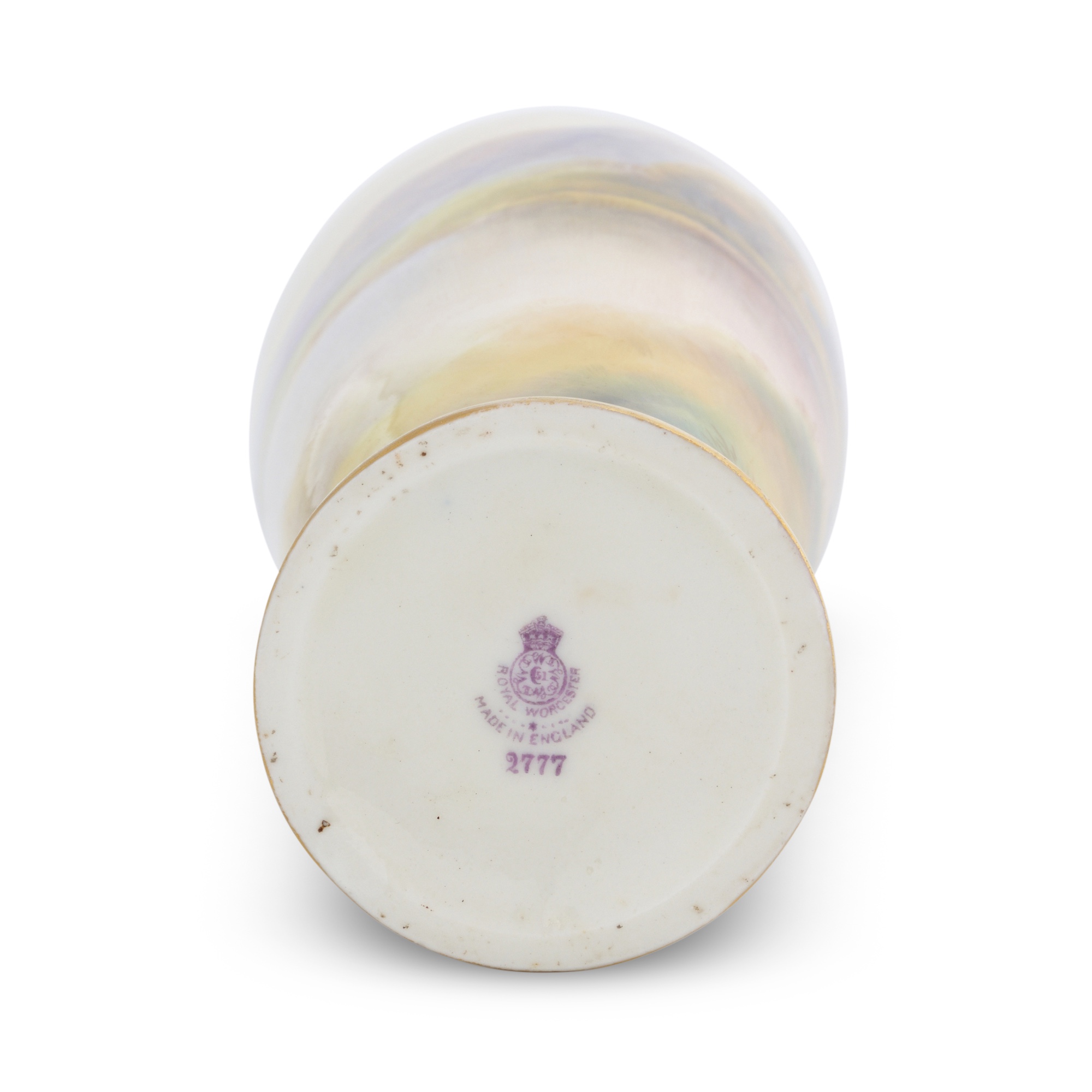 Of slender ovoid shape on a spreading foot, decorated all-round with a hilly landscape with blackface sheep and a cottage, signed, printed factory marks underside
