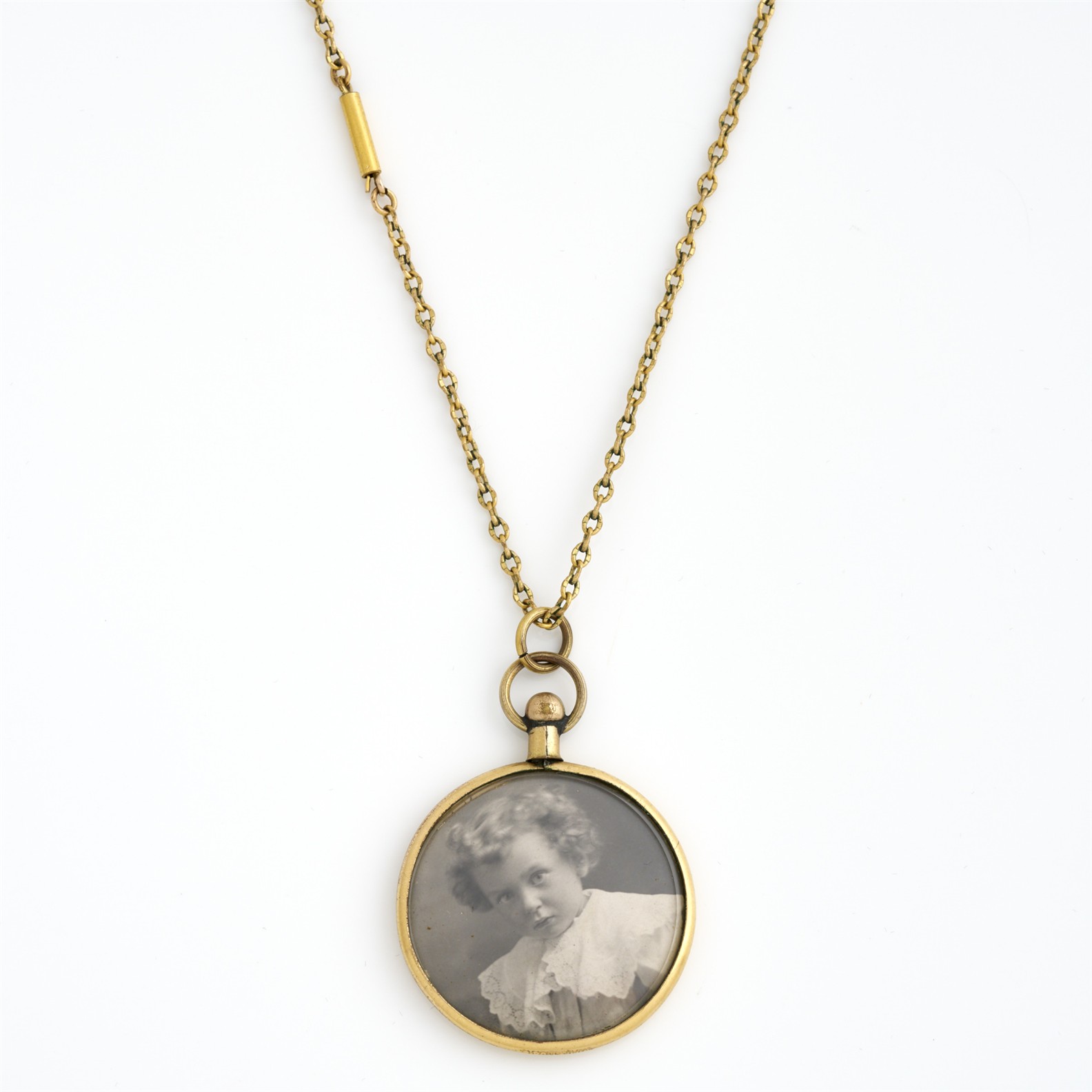 A DUAL SIDED MINIATURE PENDANT IN GOLD PLATE, TOTAL LENGTH 220MM, THE PENDANT 30MM IN DIAMETER, TOTAL WEIGHT 9.9GMS