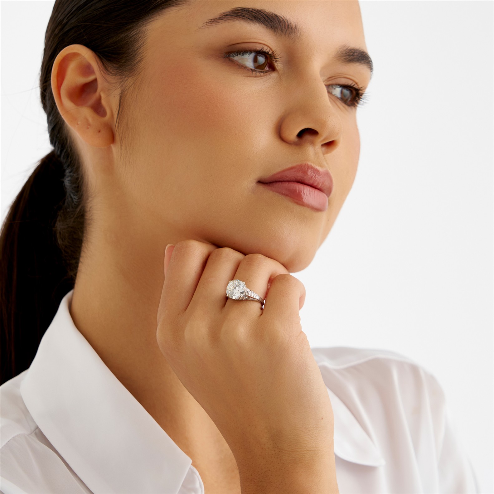 Centring a claw-set early brilliant-cut diamond weighing approximately 3.40 carats, to ornate pierced shoulders millegrain-set with step and single-cut diamonds, the small diamonds together weighing approximately 0.82 carats, mounted in platinum, size K, gross weight approximately 4.7 grams.