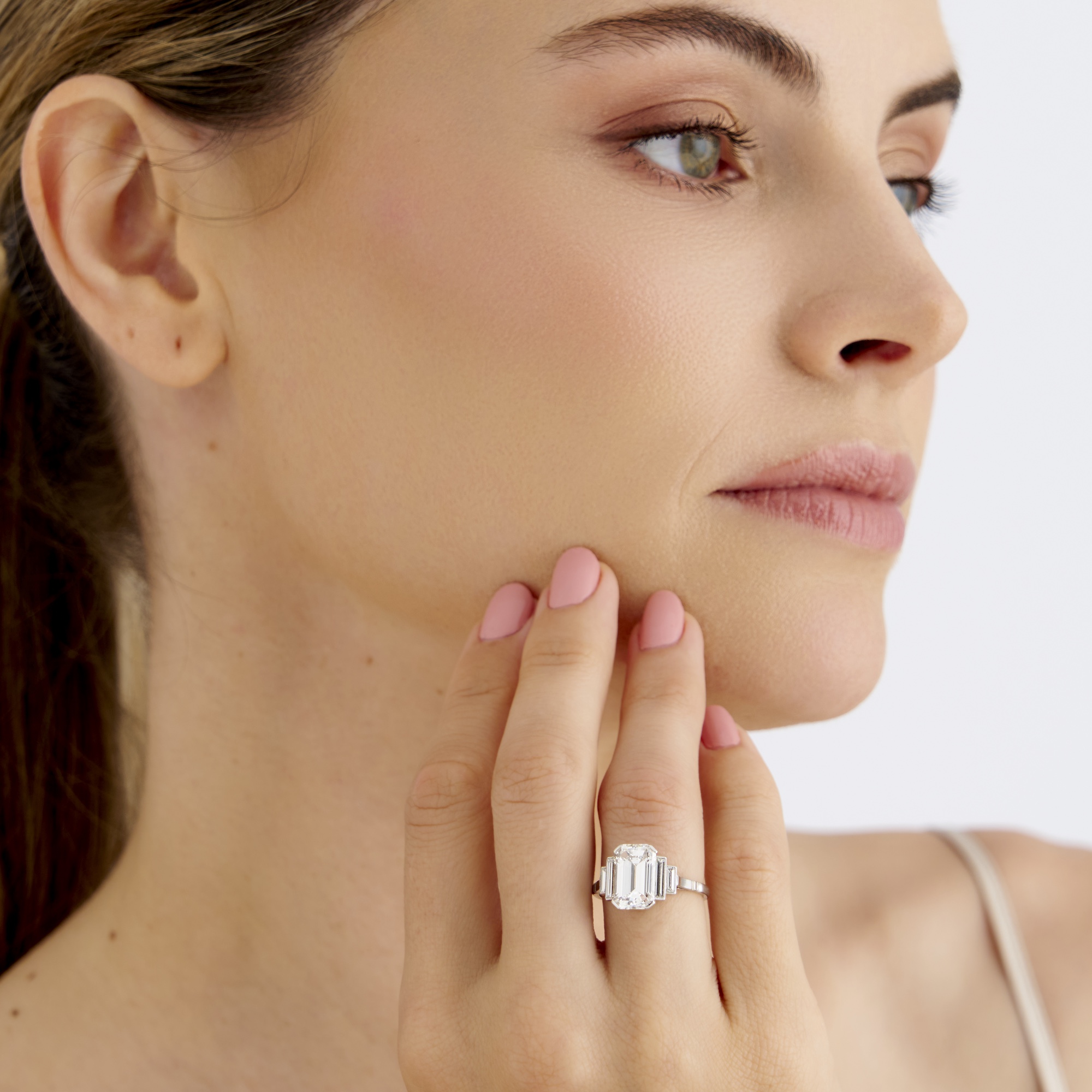 The diamonds are graded: Emerald cut diamond 3.59 carats G-H VVS-VS1; Baguette diamonds 2 = 0.30 G-H VS1; Baguette diamonds 2= 0.16 G-H VS1.