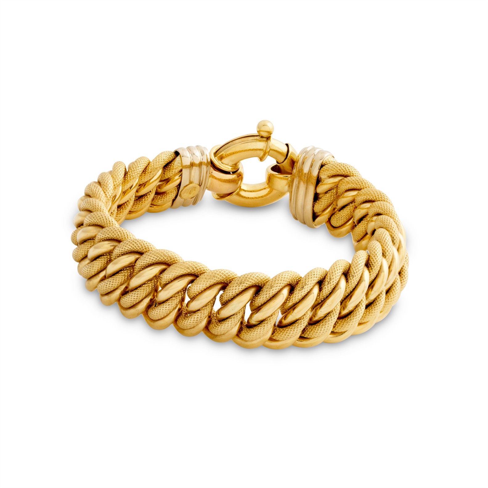 Modelled as a double curblink composed of polished and textured links, completed by a bolt ring clasp, length 200mm, gross weight approximately 44.6 grams, stamped Italy.