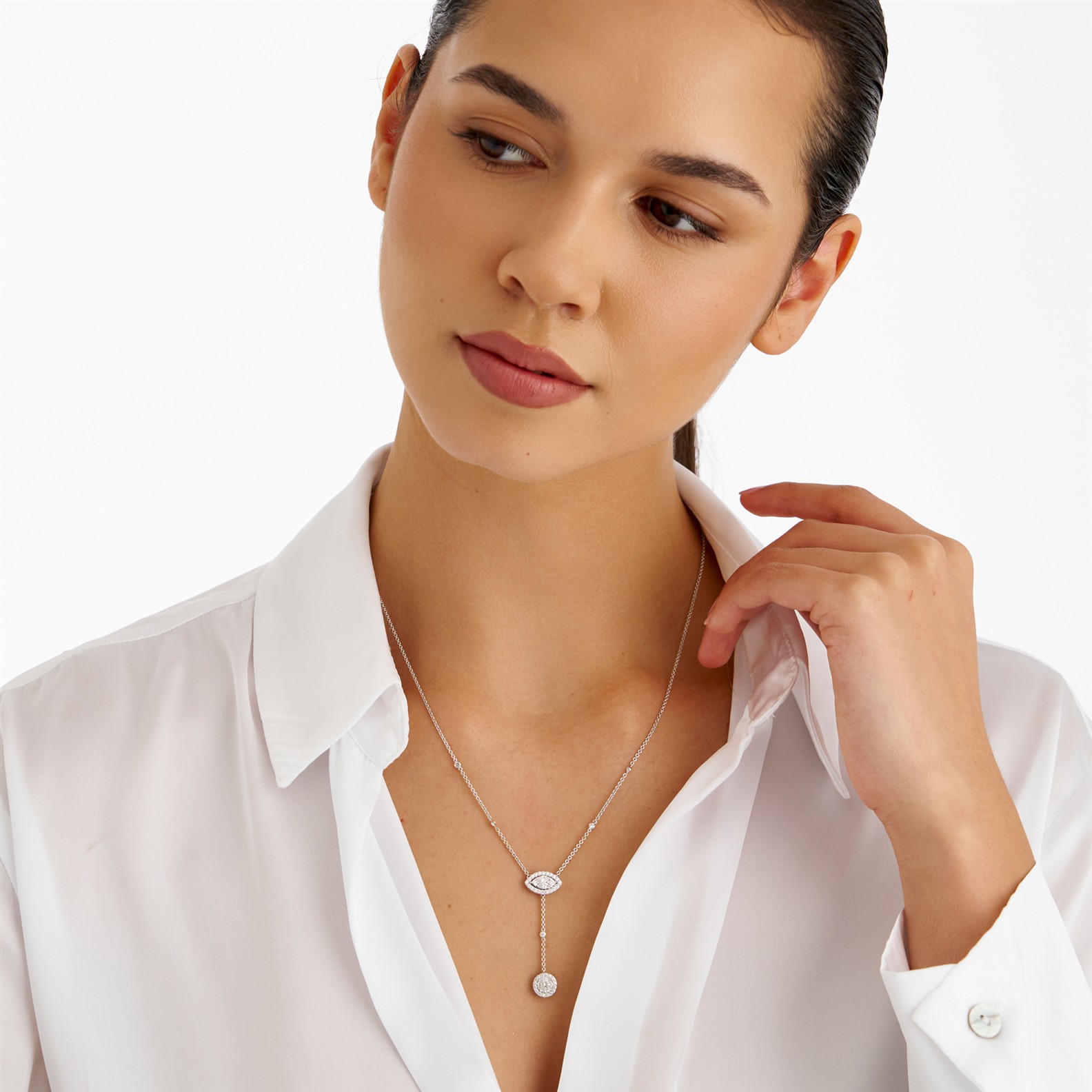 Terminating in a cluster swing drop claw-set with marquise, princess and brilliant-cut diamonds surmounted by a similarly set navette-shaped cluster, between trace link connectors, suspended from a fine chain set at intervals with spectacle-set brilliant-cut diamonds, the diamonds together weighing approximately 0.91 carats, mounted in 18ct white gold, inner circumference 530mm (adjustable), gross weight approximately 5.6 grams.