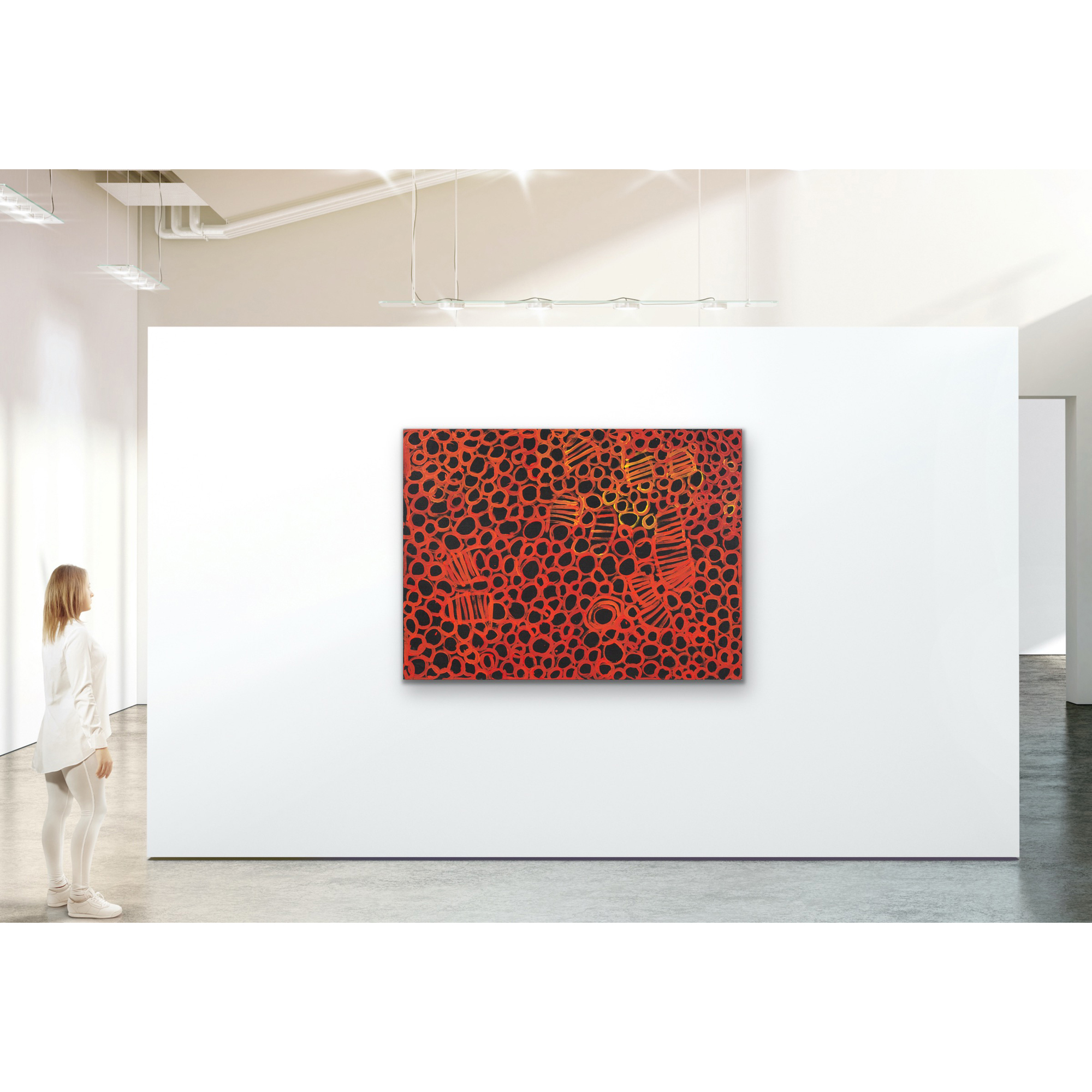 Minnie's Dreamings consist of elements of 'Bush Melon' and 'Bush Melon seed'. 'Bush Melon' is depicted using a linear design of curves, circles and breast designs in different colours creating a very loose and bold design while 'Bush Melon Seed' is big and small patches of colour strewn across the canvas.