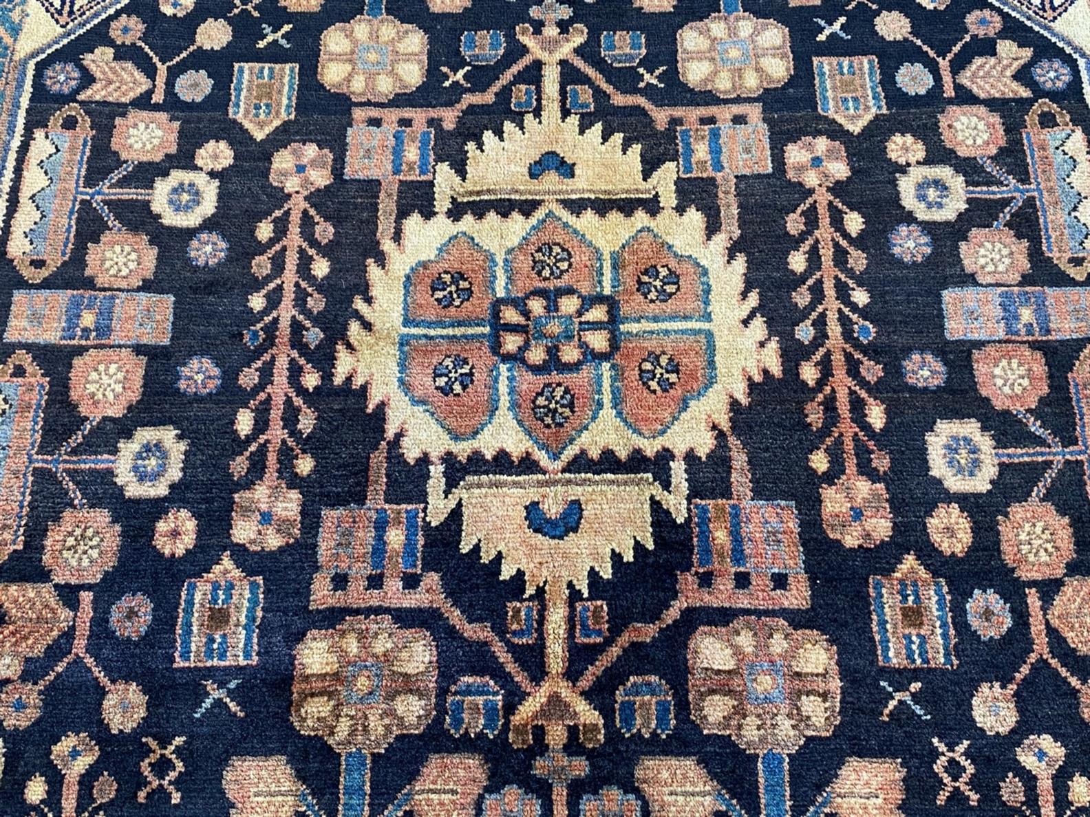 HAND-KNOTTED VILLAGE WEAVE FROM THE HAMADAN REGION WITH TRADITIONAL DESIGN OF STYLIZED GEOMETRIC MEDALLION IN A DEEP INDIGO-TONED FIELD OF BOLD FLORAL MOTIFS, TREE OF LIFE PATTERNS & BIRD FORMS.