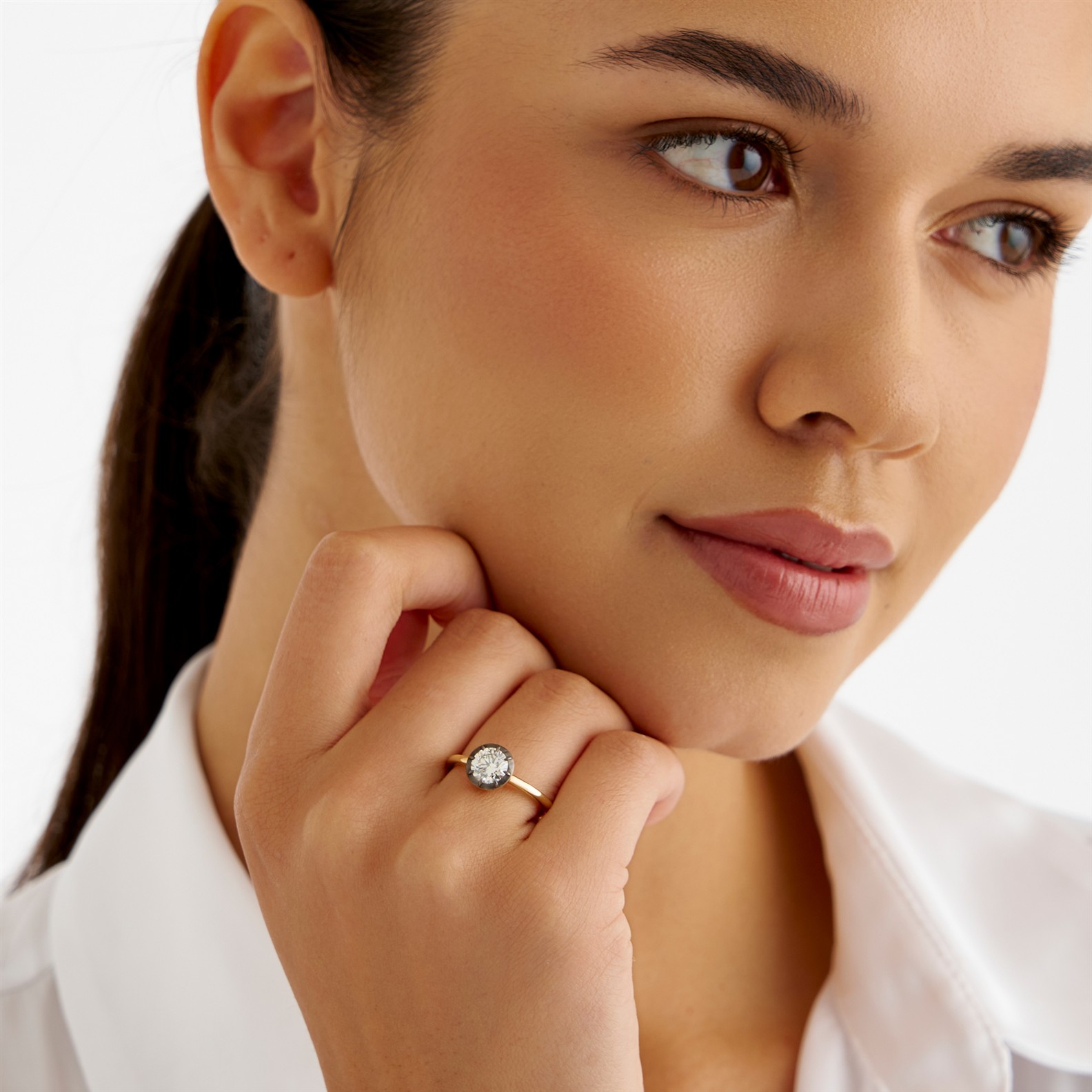 Centring a collet and claw-set round brilliant-cut diamond weighing 1.06 carats, mounted in blackened rhodium and 18ct gold, size M1/2, gross weight approximately 3.2 grams.