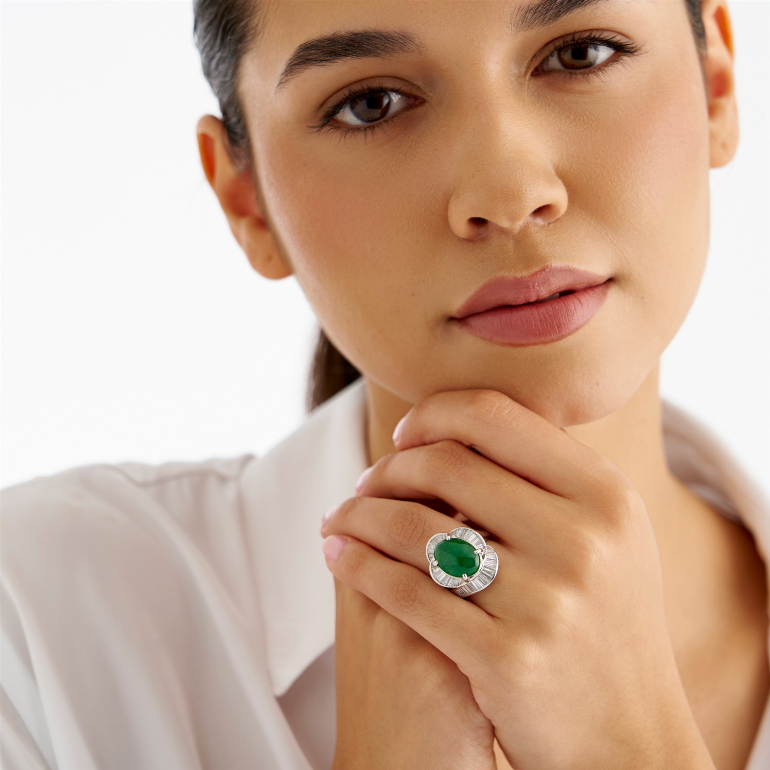 Of cluster design, centring a claw-set oval cabochon jadeite stated to weigh 6.36 carats, framed by an undulating surround of channel-set baguette diamonds, the diamonds together stated to weigh 2.02 carats, mounted in platinum, size O1/2, gross weight approximately 14.3 grams.