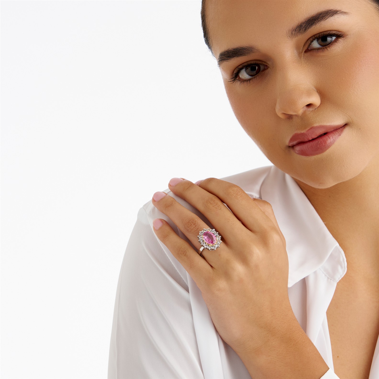 Of cluster design, centring a claw-set oval pink sapphire, weighing approximately 3.68 carats, framed by a halo of claw-set brilliant-cut white sapphires, the white sapphires together weighing approximately 1.40 carats, mounted in 18ct yellow and white gold, size S, gross weight approximately 8.9 grams.