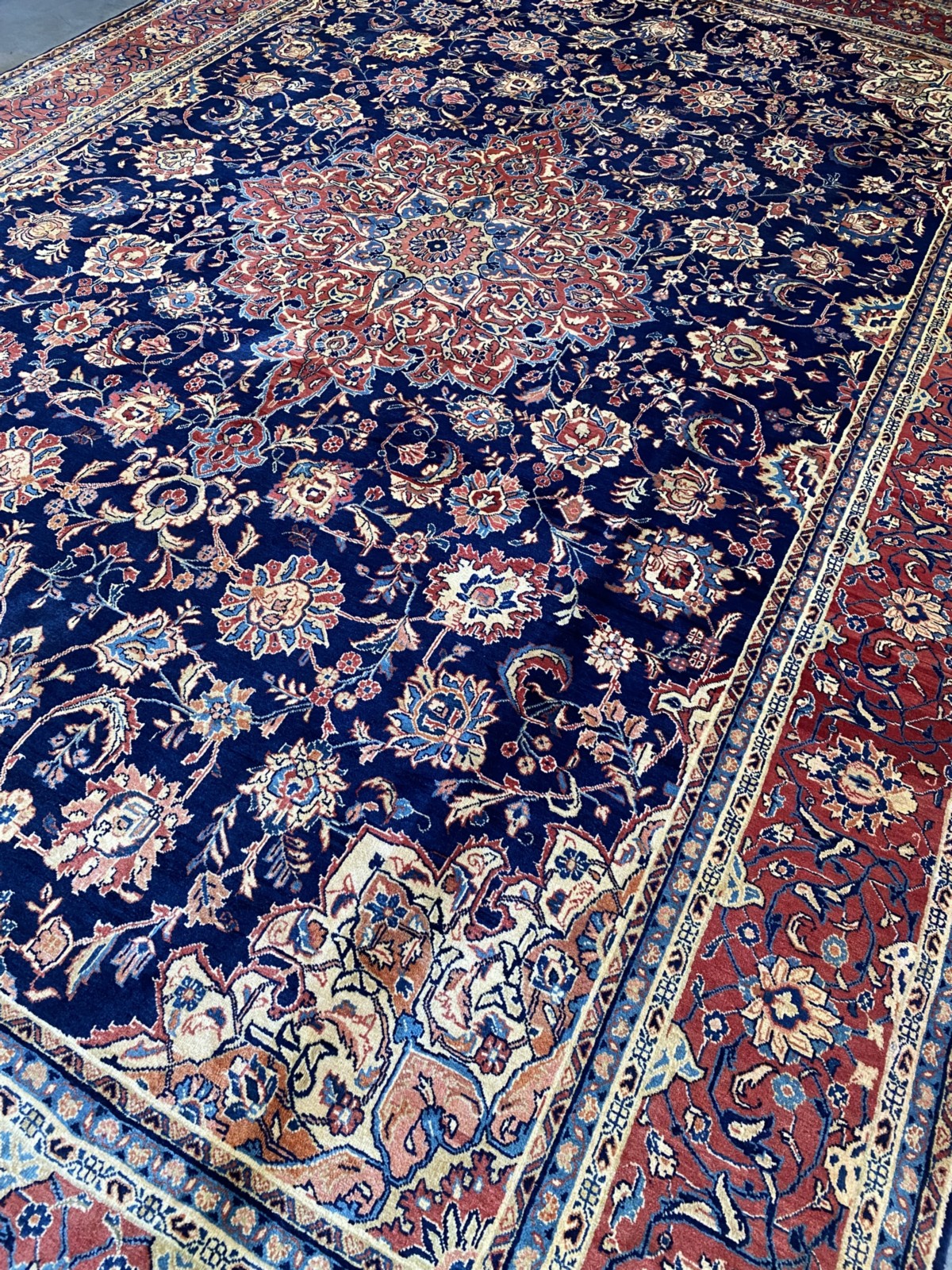 FINELY HAND-KNOTTED CITY WEAVE WITH SAROUQ DESIGN OF A FLORAL MEDALLION & QUARTERED CORNER MEDALLIONS IN A ROYAL PERSIAN BLUE FIELD OF BOLD PALMETTES, FLORAL SPRAYS & SAZ LEAVES.