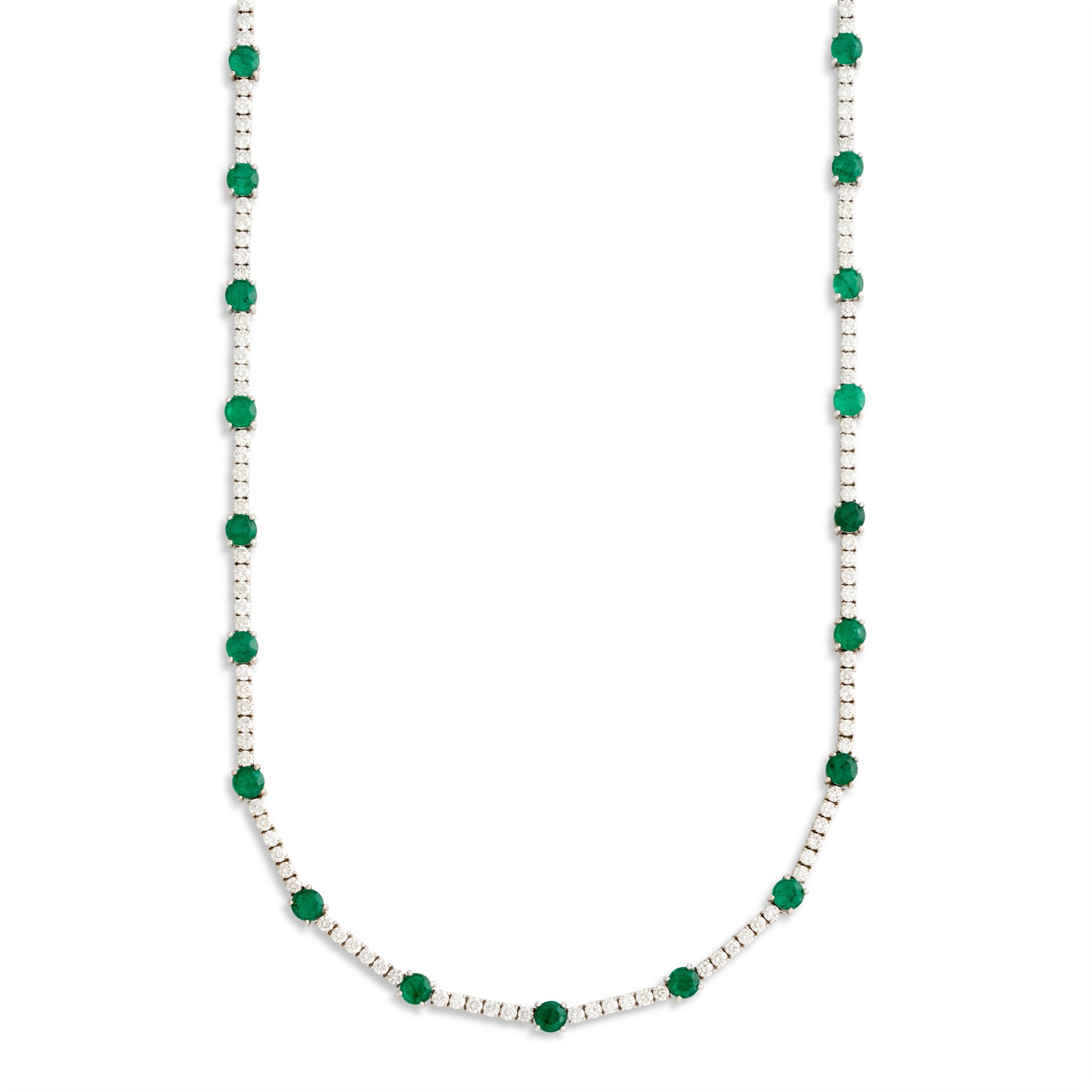Composed as a line of claw-set brilliant-cut diamonds, the diamonds together weighing approximately 10.20 carats, interspersed by claw-set circular-cut emeralds together weighing approximately 11.65 carats, completed by a concealed box clasp, mounted in 18ct white gold, inner circumference 430mm, gross weight approximately 22.6 grams.