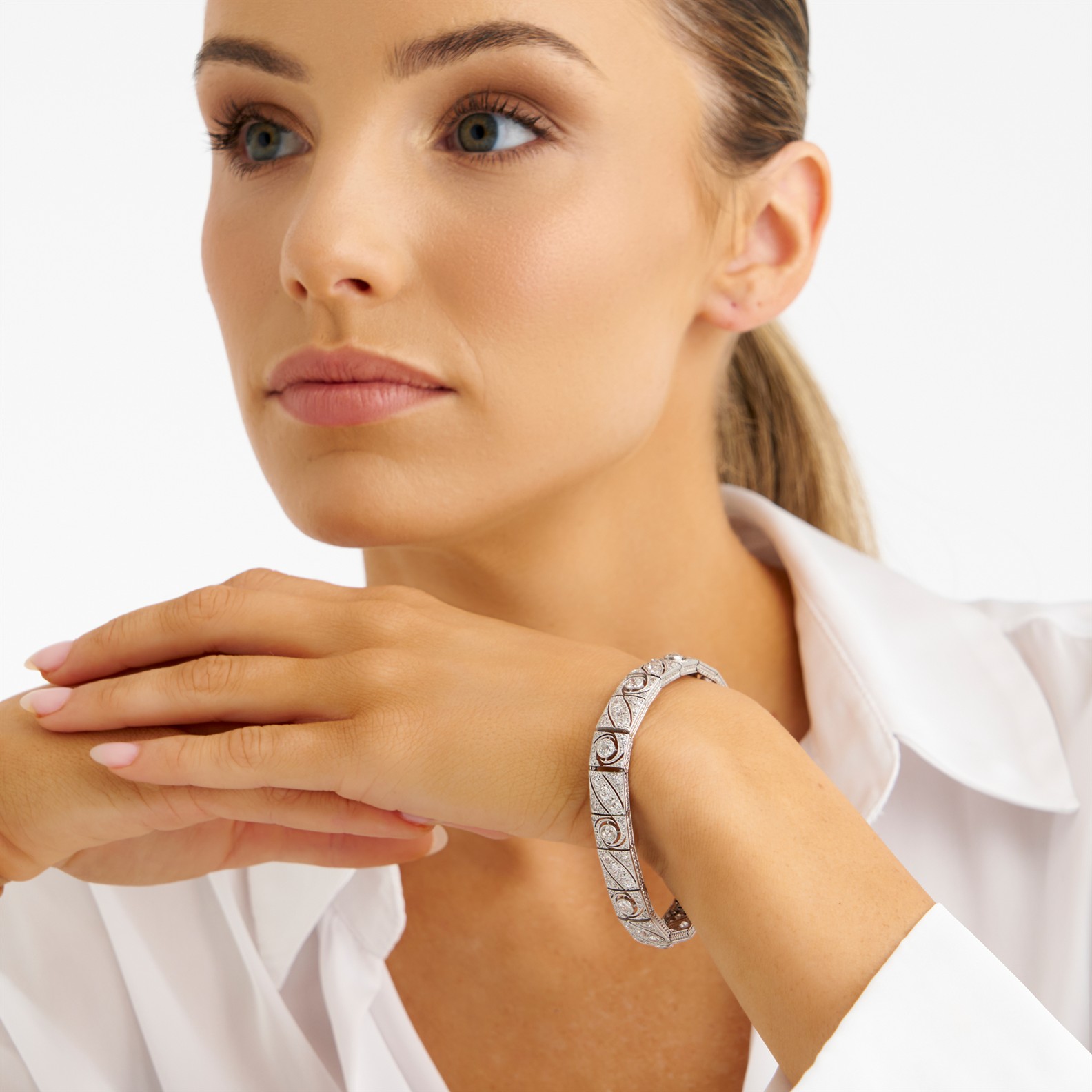 In our opinion, the diamonds are bright and lively probably ranging in colour from H to K colour and SI to pique 2 clarity as gauged and graded within the limitations of the cutting style and the mounting. The mounting has wear to the metal in the form of minor scratches. Clasp and safety clasp secure.