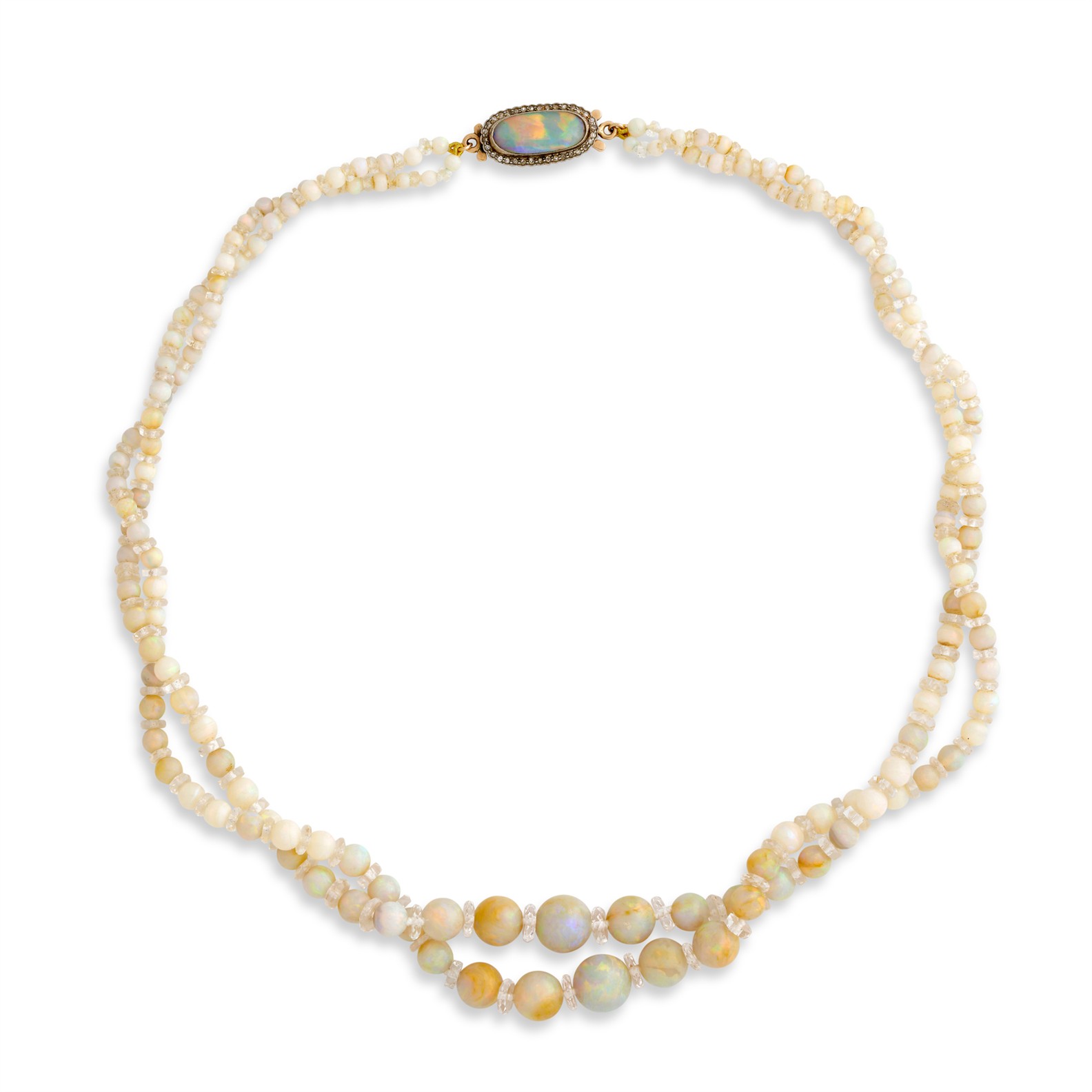 Composed as a double row of graduating opal beads measuring 11.3mm to 3.8mm, interspersed with faceted rock crystal rondelles, completed by an 14ct gold opal and diamond clasp, inner circumference 500mm, gross weight approximately 42.8 grams.