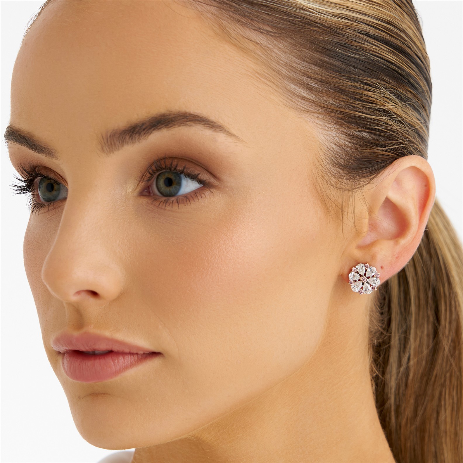 Each of floral design, centring a claw-set fancy pink brilliant-cut diamond to petals claw-set with pear-shaped diamonds, interspersed with similarly set fancy pink diamonds, the fancy pink diamonds and near colourless diamonds together weighing approximately 0.40 carats and 2.45 carats respectively, mounted in platinum and 18ct rose gold, post and clip fittings, diameter 14mm, gross weight approximately 7.1 grams.