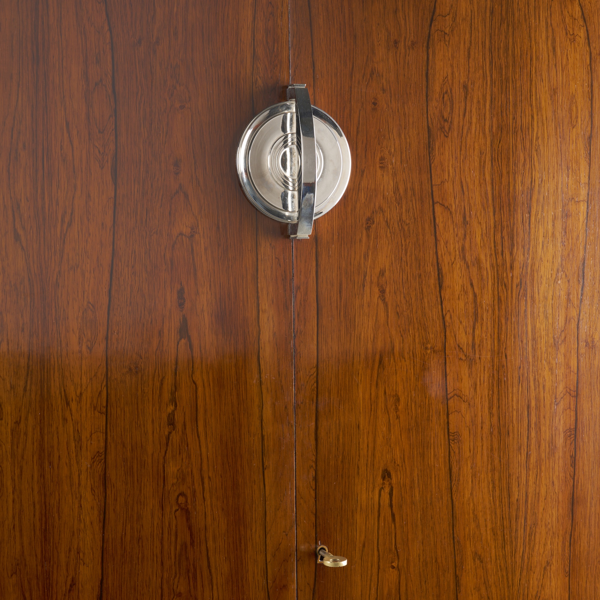 Of rectangular outline, the moulded cornice above a central pair of doors flanked by chromed metal-framed glazed doors, all enclosing adjustable shelves, on a recessed and moulded plinth base