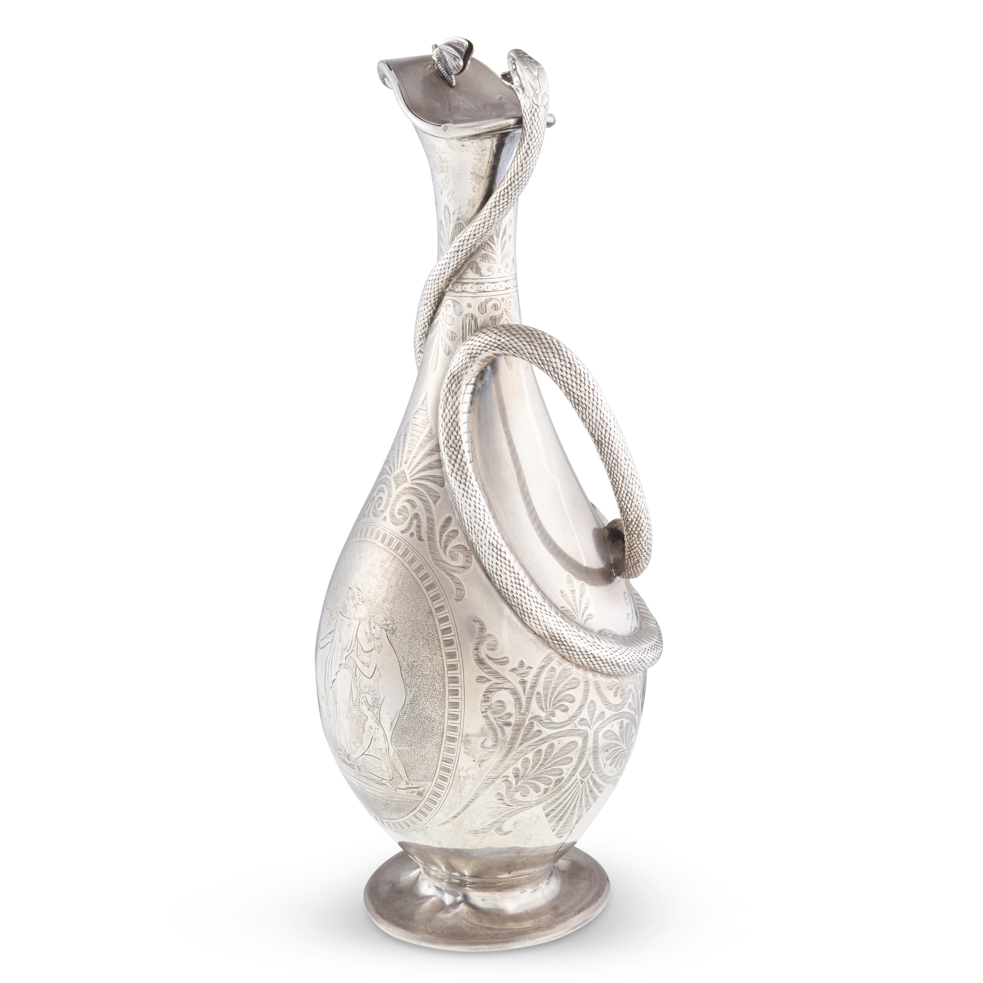 Baluster-shaped on a circular foot, the handle modelled as an encircling serpent, the finial of the cover as a butterfly, the body decorated with engraved palmettes and oval reserves to both sides enclosing Classical Greek figure groups, a reserve below the spout engraved 'Regimental / Hunt Cup / Scots Greys / 1870 / Won by Mr Rowes / "Quicksilver"'