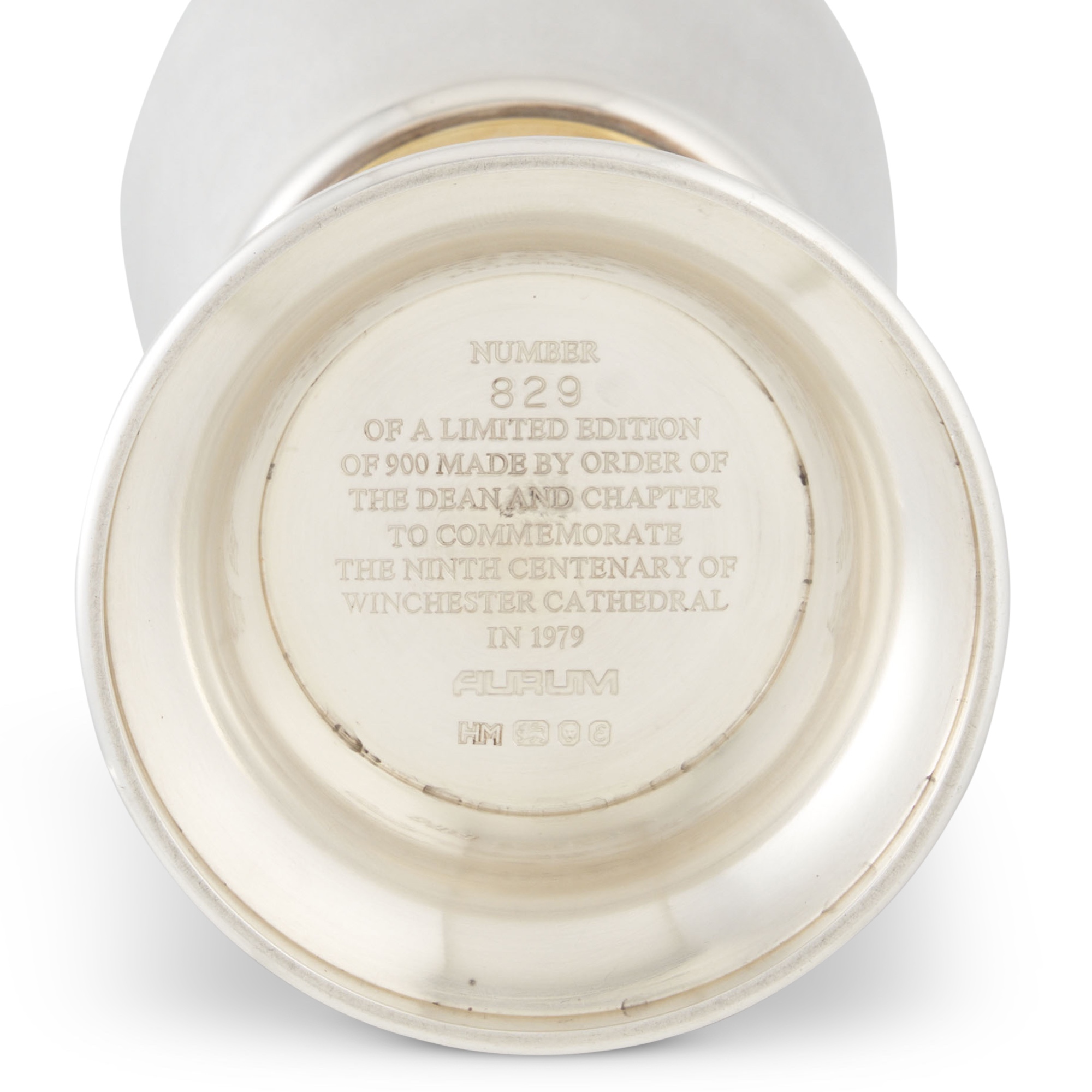 The slightly tapering cylindrical bowl on a gilt stem encircled by figures of Saint Swithun, King Alfred, Bishop Wakelin, William of Wykeham, Prior Kingsmill, Mary Tudor, and others, all on a spreading circular foot, the interior gilt, impressed inscription and number underside, accompanied by Aurum's conformingly numbered booklet on the goblet