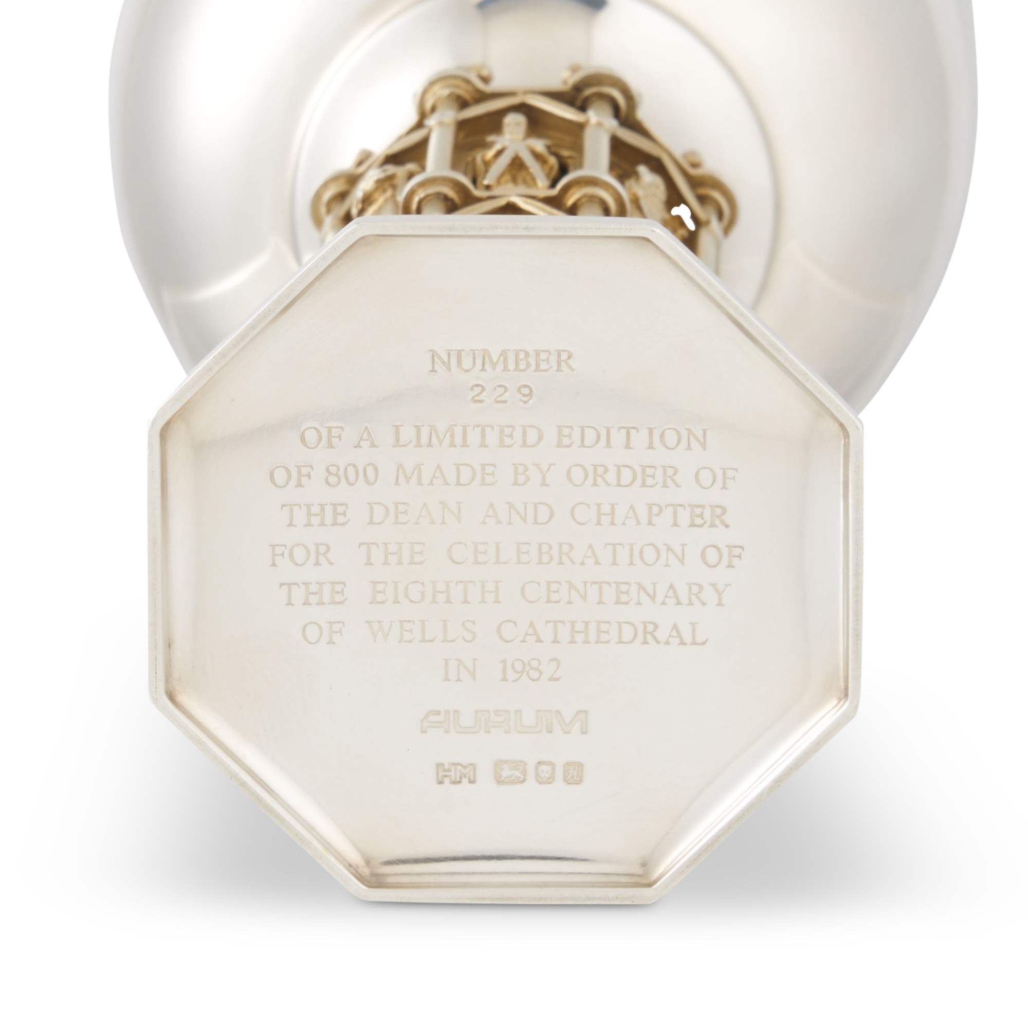 The broad rounded bowl on a gilt openwork stem of two tiers of figures of monarchs, bishops, and others associated with the history of the Cathedral within Gothic niches, all on a spreading octagonal foot, the interior gilt, impressed inscription and number underside, accompanied by Aurum's conformingly numbered booklet on the goblet