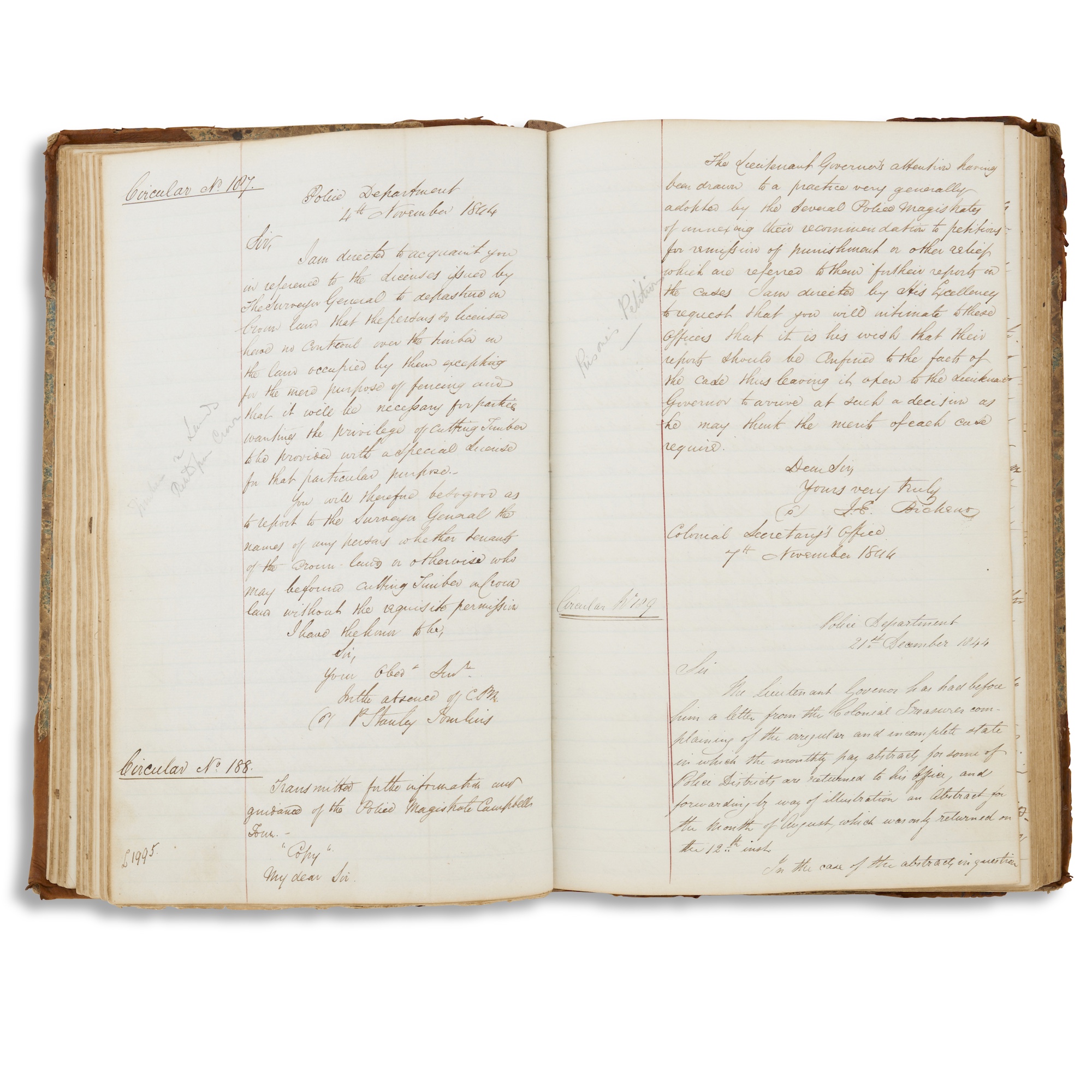 A neatly-kept chronological manuscript record of official colonial government circulars from the offices of the Colonial Secretary, Chief Police Magistrate, and others giving directives and advising policy on a range of police-related and other matters of local administration, interspersed with memoranda by officials and magistrates of the Campbell Town district on the same; after preliminary leaves devoted to the beginnings of an index, the entries begin with 'Circular No. 1' dated 8 February, 1832, and run to the last, 'Circular No. 369', dated 15 October, 1857, all in brown ink in various hands (none identified) carefully transcribing each circular and memorandum and their signatories and dates; the margins with occasional later short notes in pencil briefly indicating the subject of a particular circulars, these apparently corresponding with a pencil note on the second leaf, 'Examined', followed by a set of initials