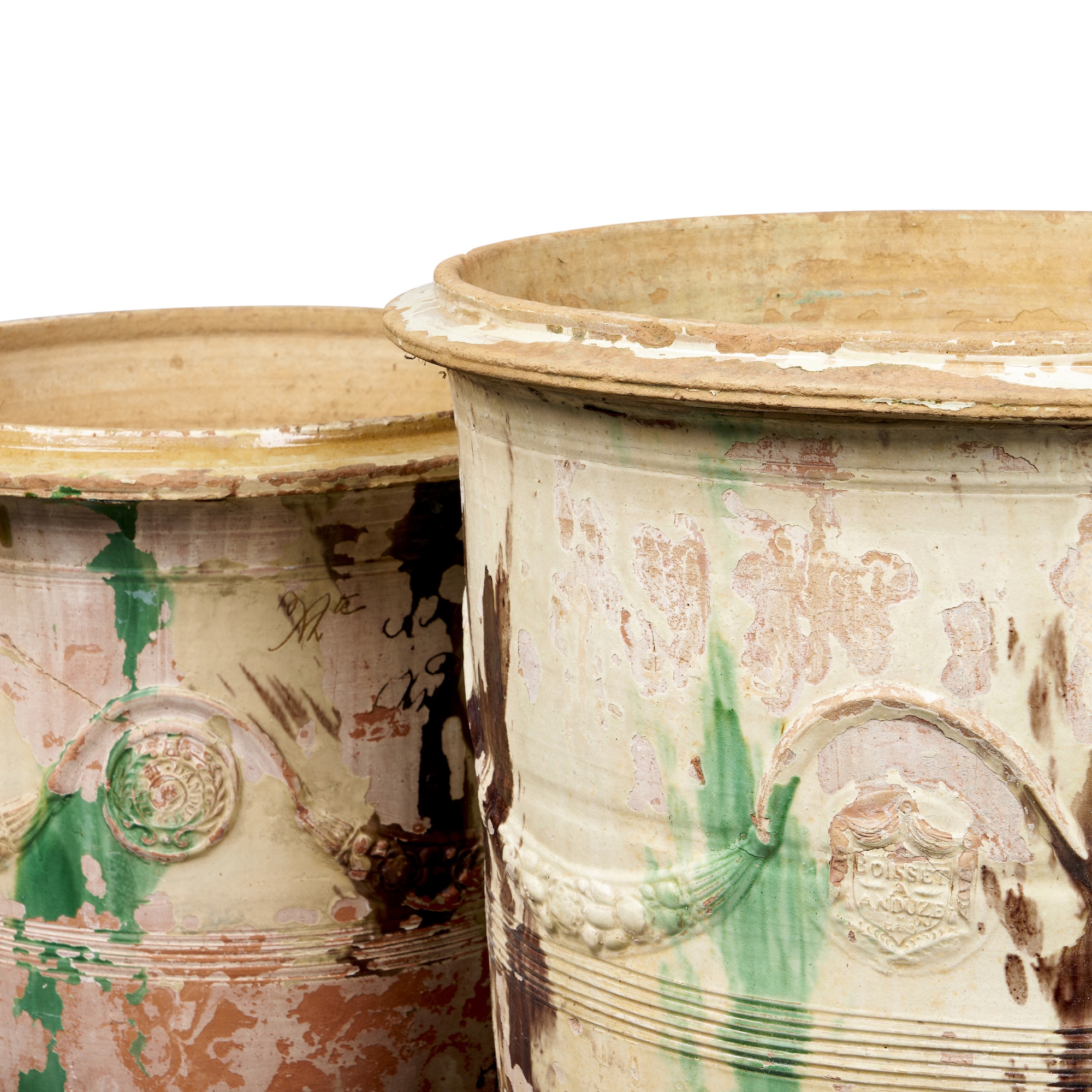 TWO SIMILAR LARGE ANTIQUE ANDUZE GLAZED EARTHENWARE PLANTERS