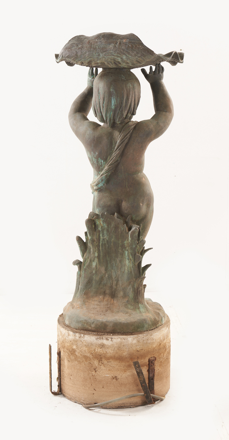 Modelled as a putto standing and raising a large shell, standing upon a concrete base