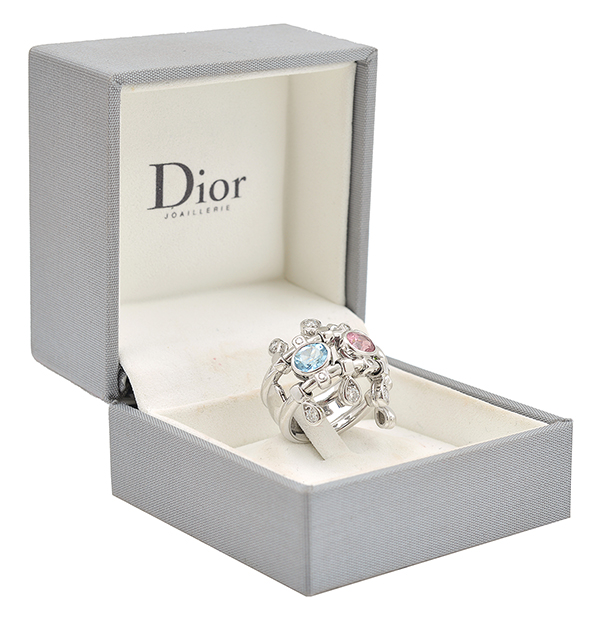 Centrally set with an oval cut blue topaz, pink tourmaline and green peridot, with diamond detail throughout, mounted in 18ct white gold, ring size J, boxed.