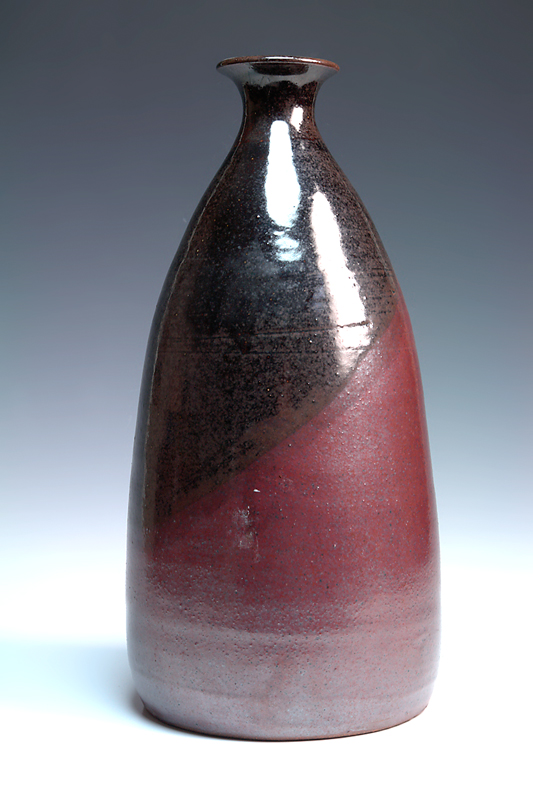SEVEN PIECES OF JAPANESE POTTERY, including gilded rotund koro, two Shigaraki ware vases, tamba pottery sake container, shino glazed bowl, turquoise glazed pot and snake skin style glazed vase The sake container 33cm high.