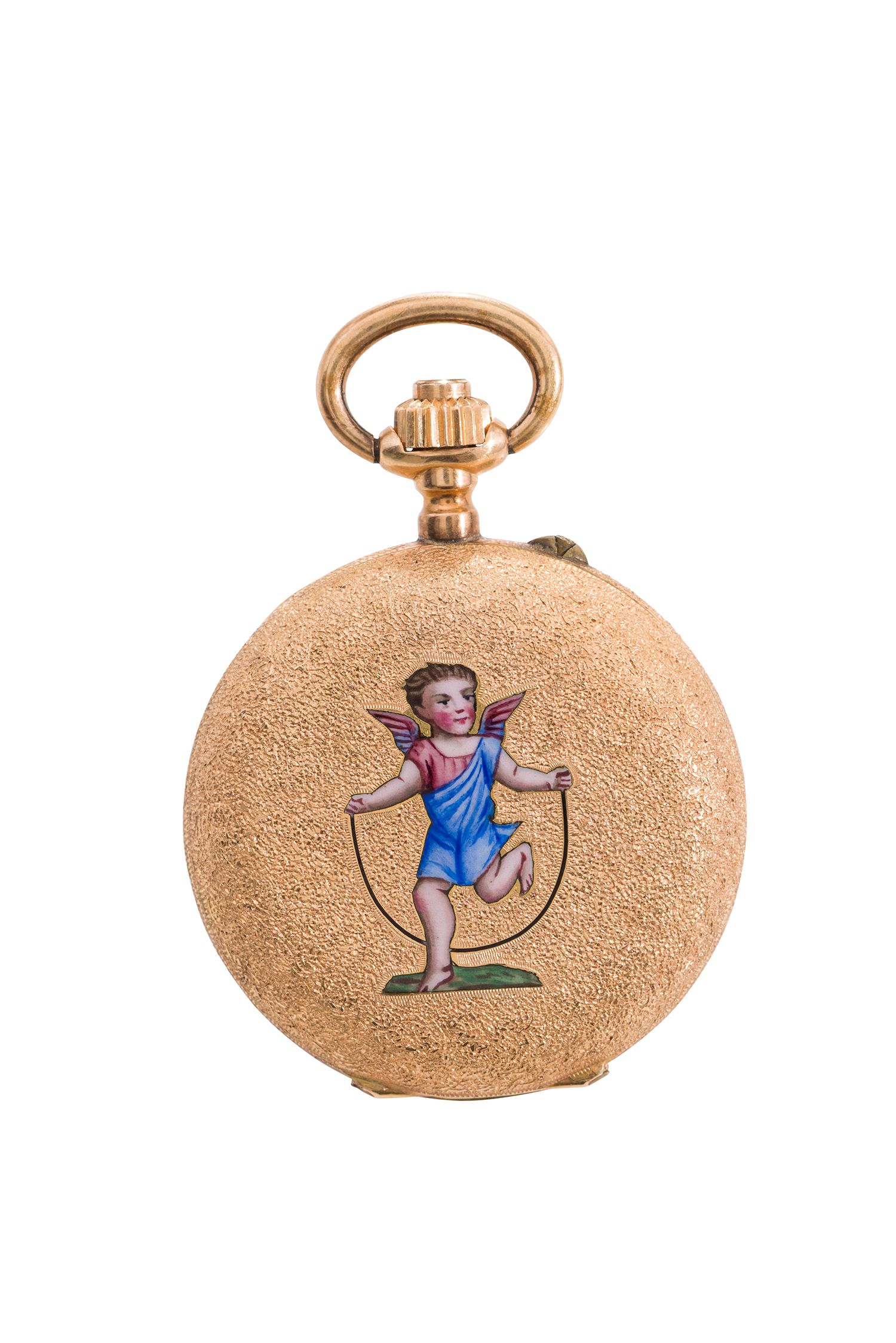 Cylinder movement, the white circular dial with black Roman numerals, having diamond set elaborate gold hands, dial and curvette signed Durean Geneve, 18ct gold engraved case with an enamel cherub to one side and a bird and leaves to the other, 26mm diameter, boxed.