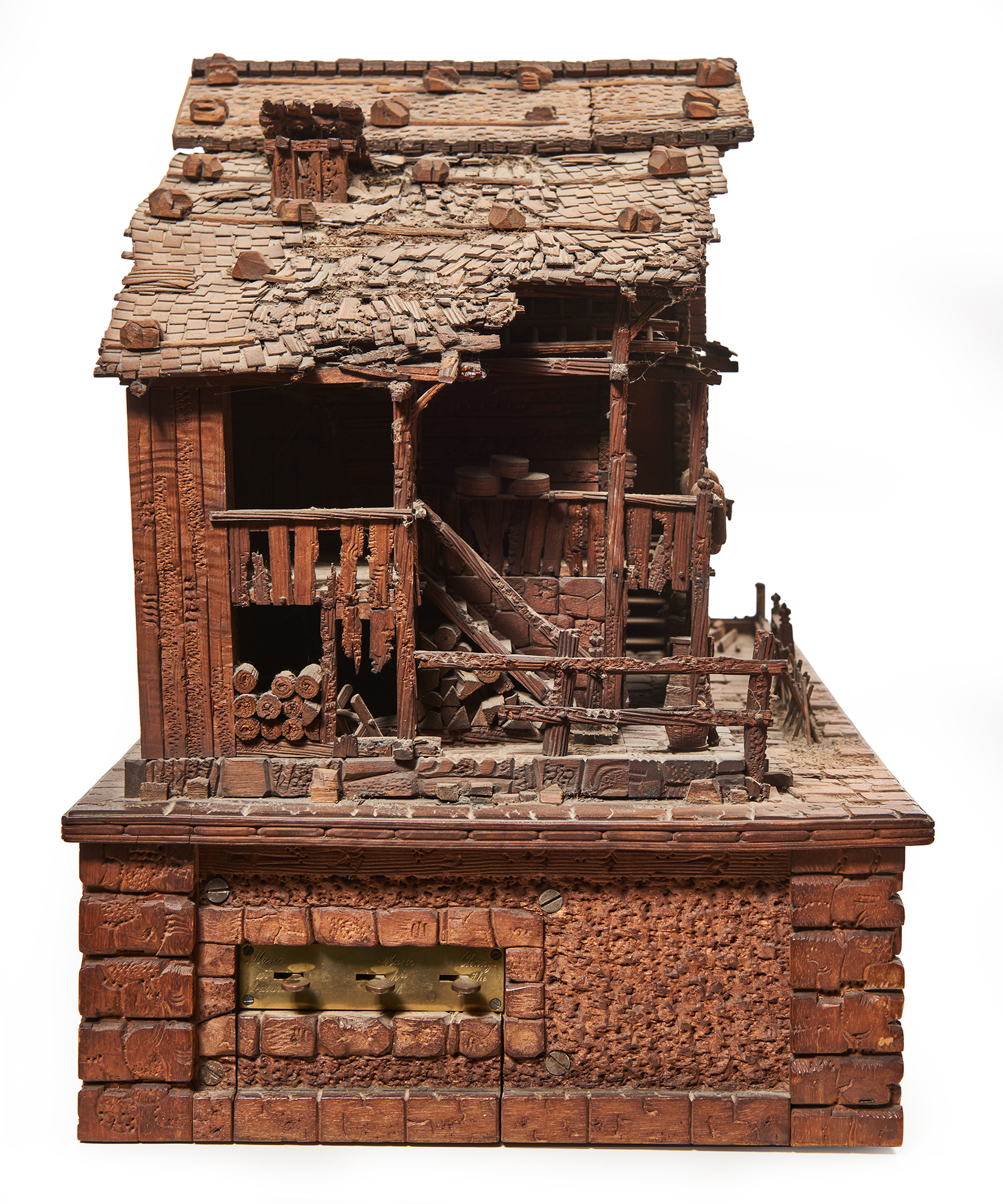 Modelled as a Swiss chalet. One half of the chalet has been made in the form of a run down house, the other portion shown tidy, well kept, maintained and used as a residence. The base decorated with bears, eagle and foxes. Striking clock with a six tune music box to base
