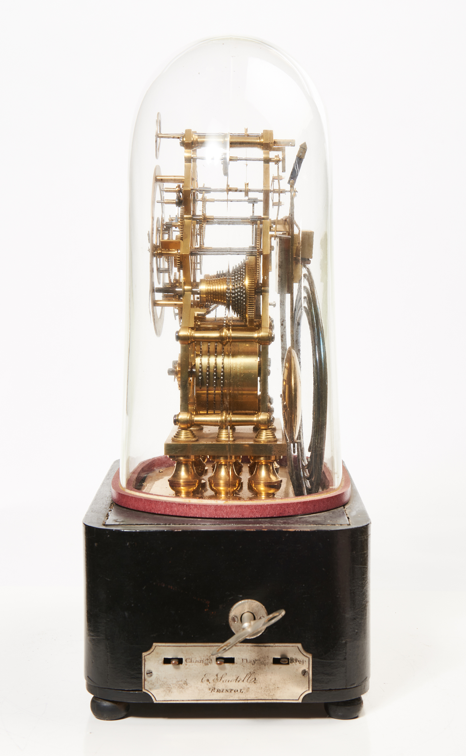 The brass fretted plates standing on an ebonised case base. The silvered ring dial with subsidiary seconds above dial. The signed silvered chapter ring with engraved Roman numerals and a smaller silvered subsidiary dial mounted above with seconds readout. The eight day twin chain fusee movement with anchor escapement, hour gong strike with four tune musical box by Ducomman Girod in wooded base released each hour. All under glass dome