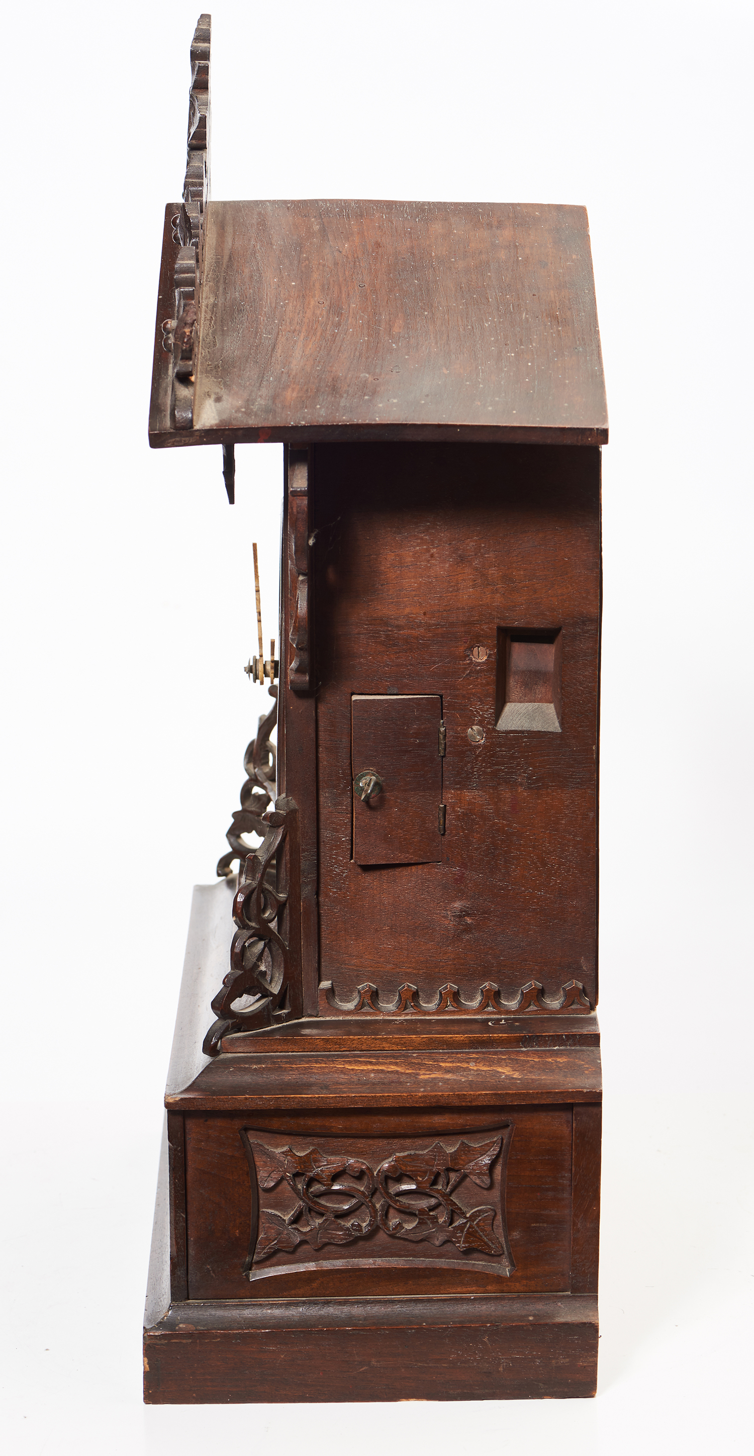 repair to one leaf on crest. Quail on quarter strike and cuckoo on hour strike. Leather on the bellows have been replaced, however the bellows are original. Working, however not recently serviced or timed.