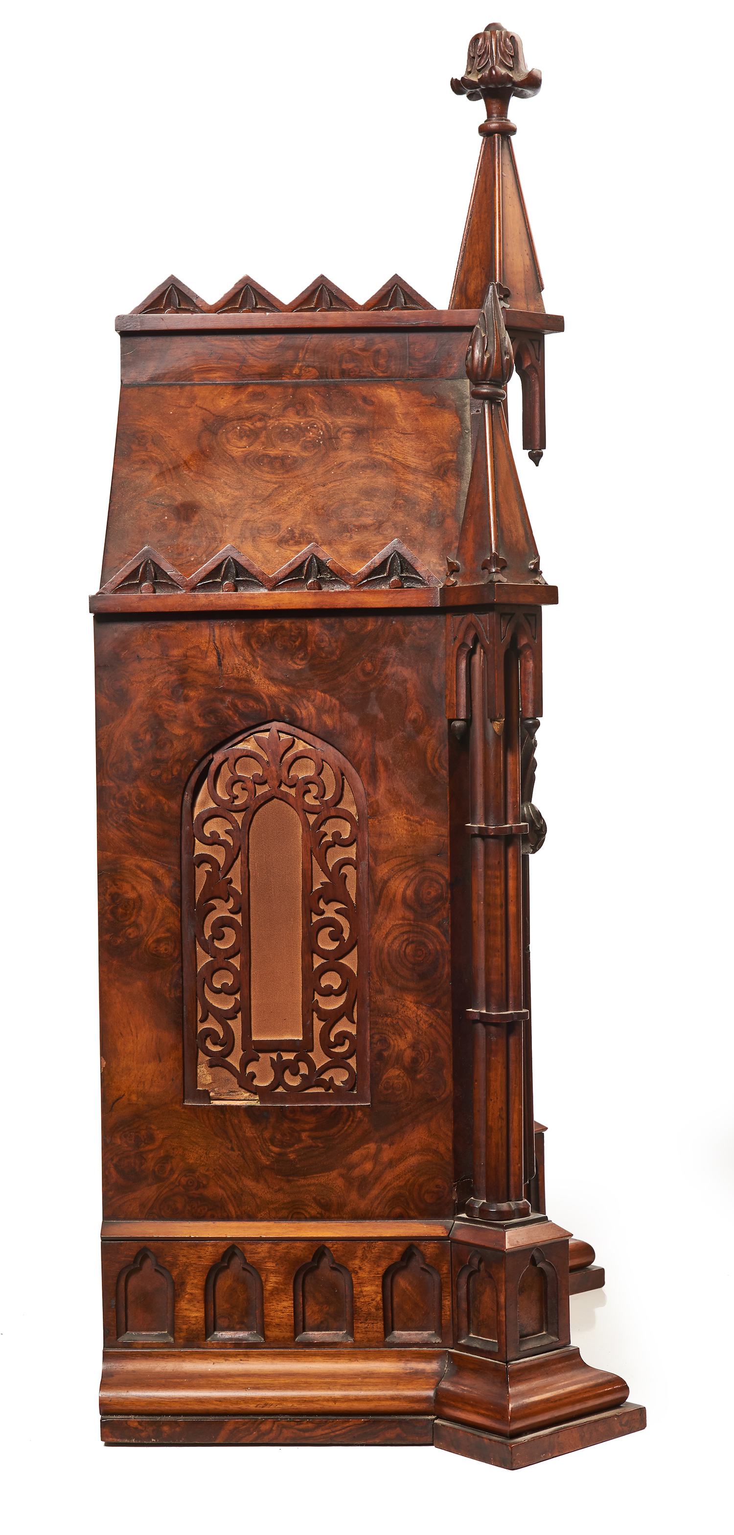 The case of Gothic style, walnut veneered with three spires to stepped top of case. The arched door with scalloped top flanked to each side with cluster columns. The case decorated to front and sides with inset Gothic panels. The whole clock mounted on original bracket. The one piece silvered dial with Roman numerals engraved to dial corners, also engraved slow/fast, strike/silent around arbours in dial arch. The dial signed I. Morrison- 27 Packington St- London. The three train, eight day going, fusee movement with anchor escapement chiming the quarters on eight bells
