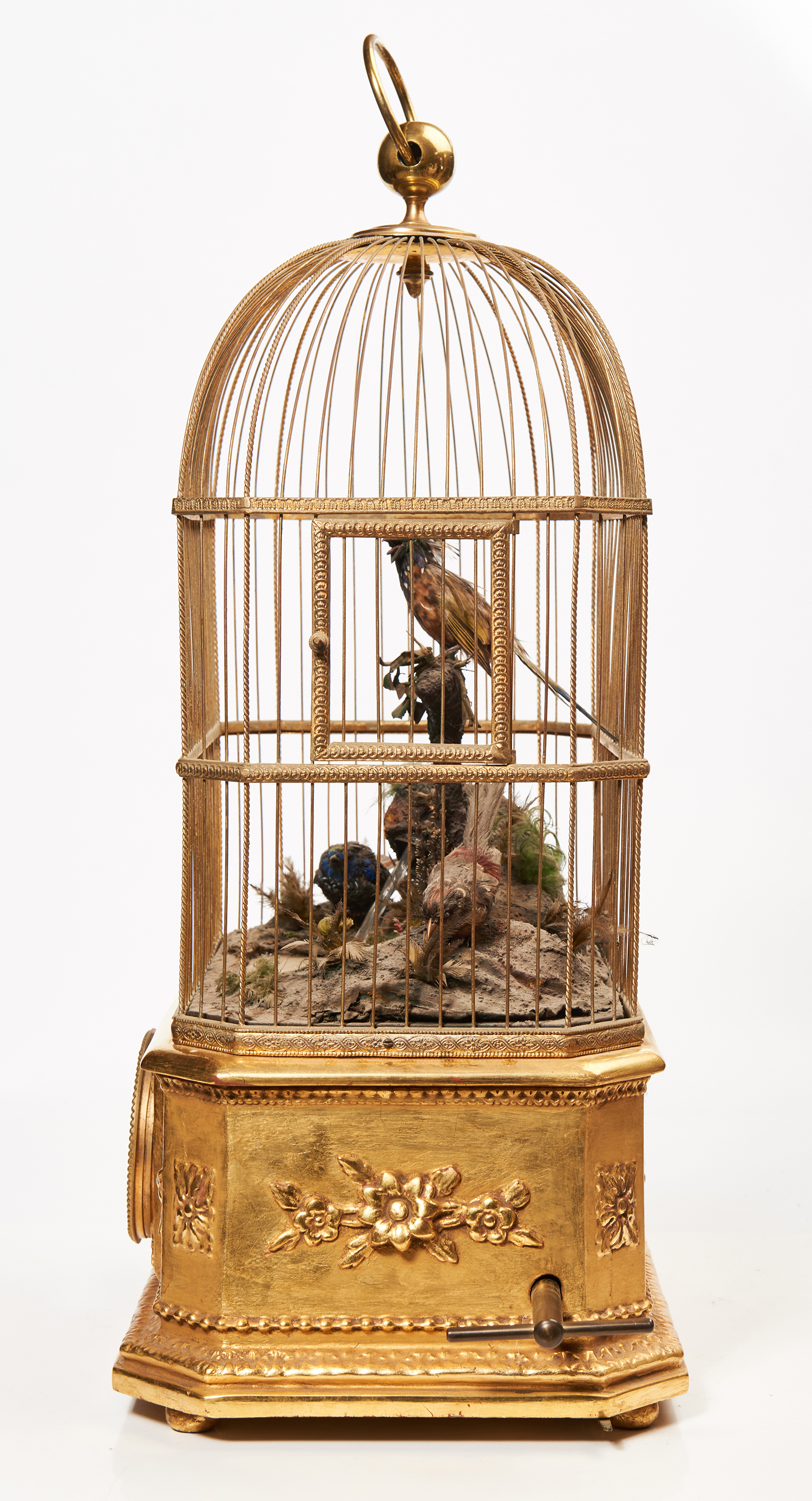 Three singing birds in a gilded cage with twist glass waterfall into mirror pond. Bird in tree singing while birds on the ground are feeding and drinking from pond. Gilt wood base with French striking eight day clock. White enamel dial to base.