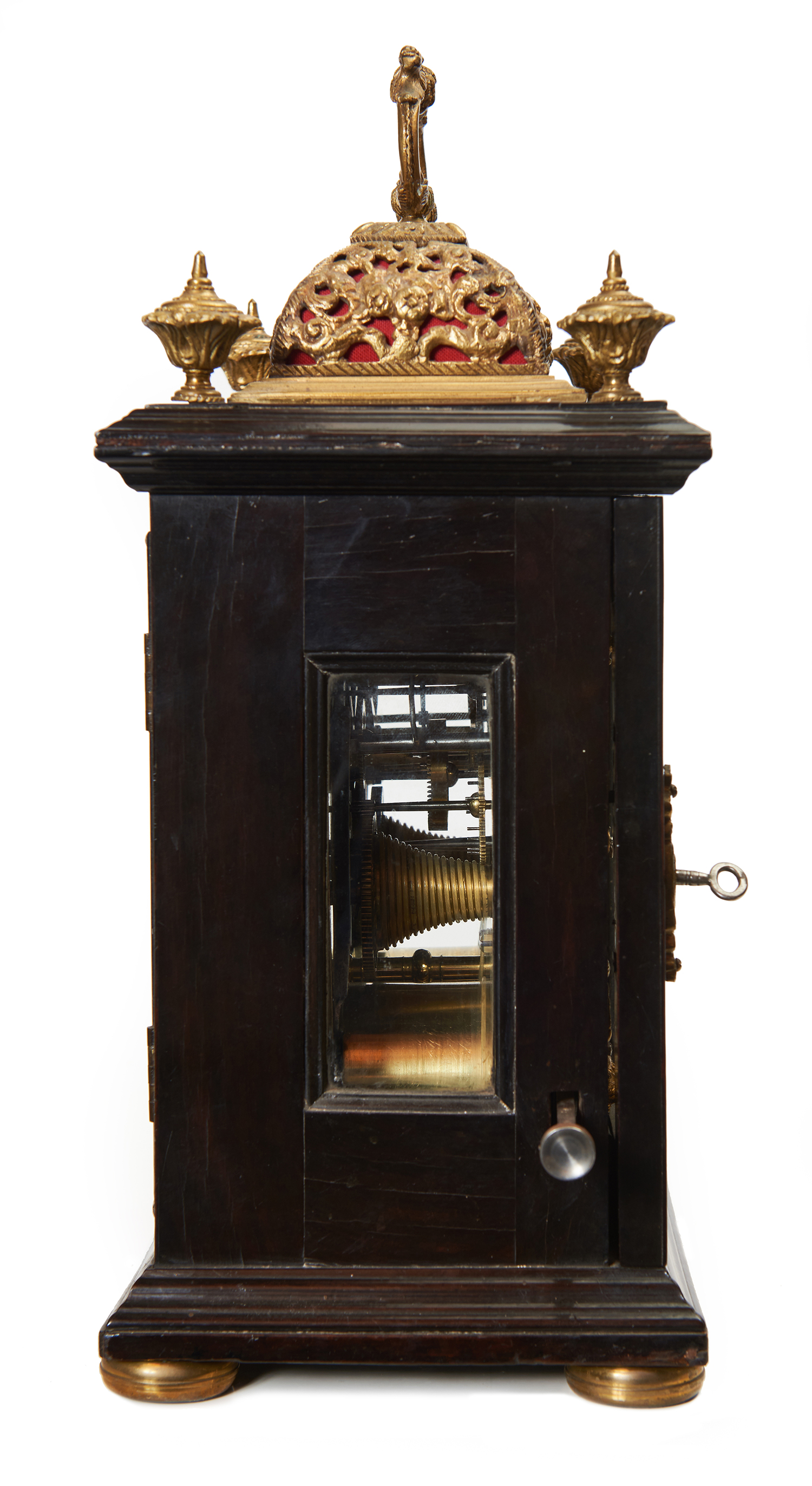 The ebonised case with pierced gilt metal basket top centred by a cast brass carrying handle. Stylized finials to the four top corners of the case. Glazed side panels raised on a moulded base and ebony block feet. The square brass dial plate with silvered Roman and Arabic chapter ring and blue steel hands. The matted centre with ringed winding holes and engraved decoration to the calendar aperture. The chapter ring flanked by cherub head spandrels. The twin fusee, eight day going and bell striking movement with verge escapement. Small bob pendulum. Pull repeat on three bells can be manually operated by push bar. The rectangular backplate profusely engraved with foliate scrolls around central reserve bearing the signature Jacobus Markwick - Londini
