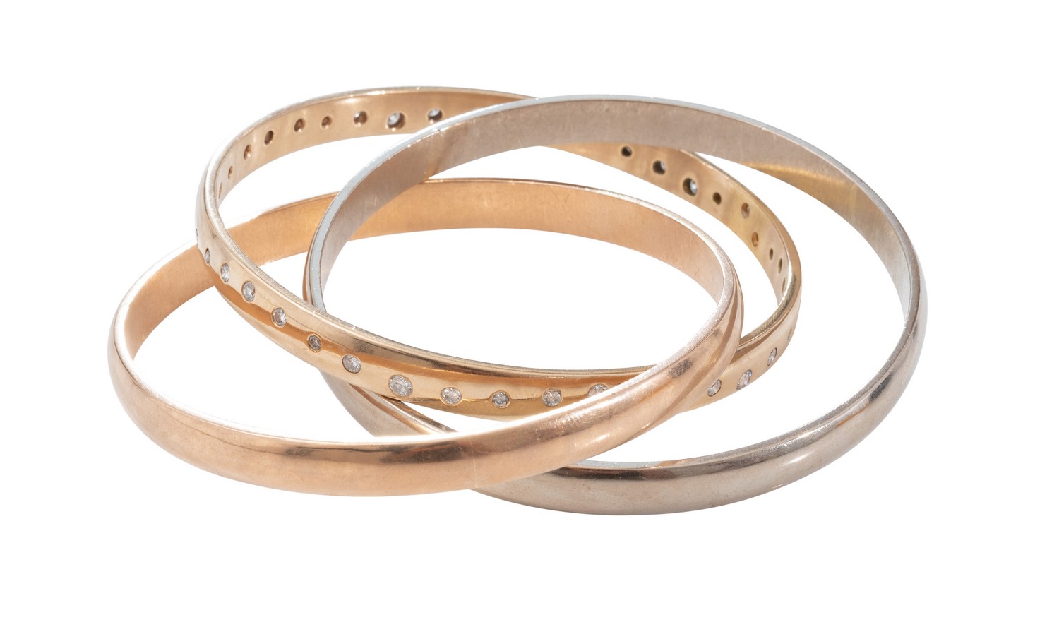 Designed by Catanach's, comprising interlocking bangles, one hammer set with round brilliant cut diamonds, all in 18ct yellow, rose and white gold.
