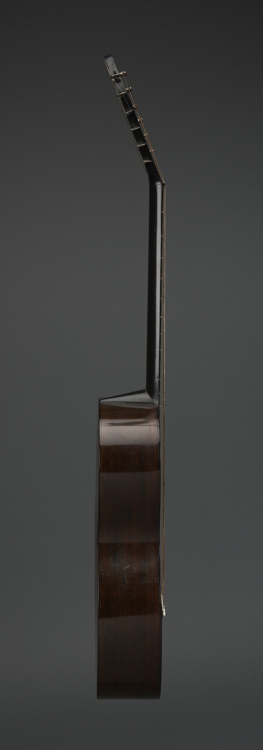 Scratches and wear overall consistent with age and use. cracks to headstock and two significant cracks visible beneath bridge. Crazing to varnish overall. Minor losses to varnish. Small circular repair to verso. soundboard deformed.