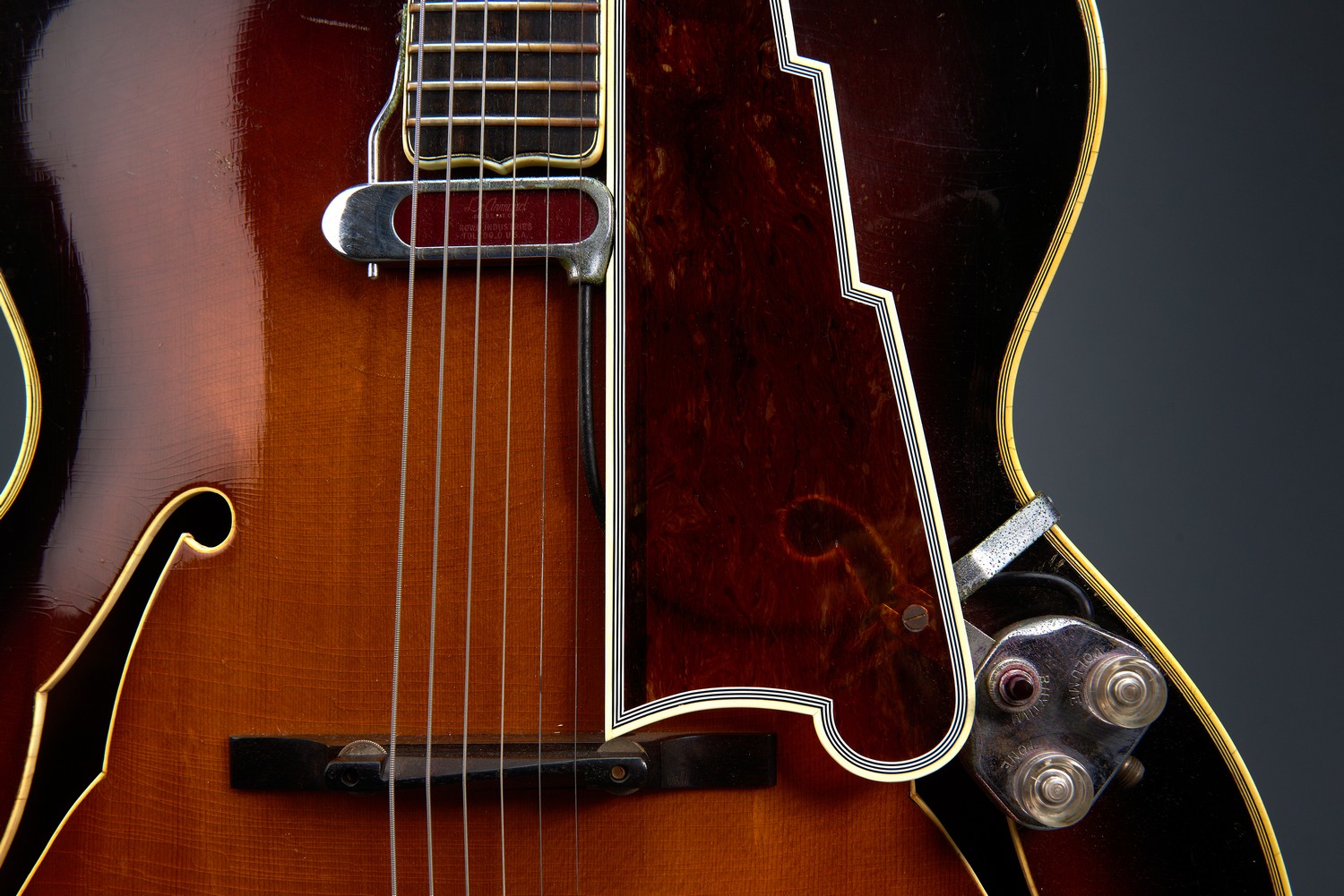 Crazing to varnish overall. Minor dents and loses, consistent with age and use. requires servicing- corrosion visible to frets. pick guard replaced. small part of f hole binding reglued.