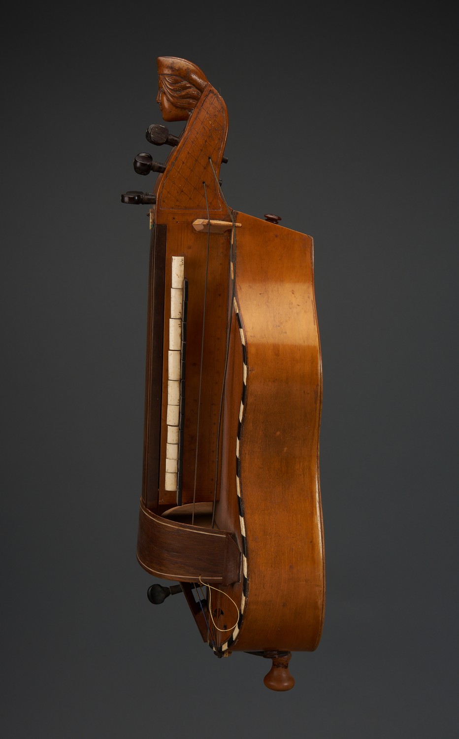 The whole decorated in polychrome decoration with a carved male head emanating from peg head. Bone inlay. Contains Brazilian rosewood