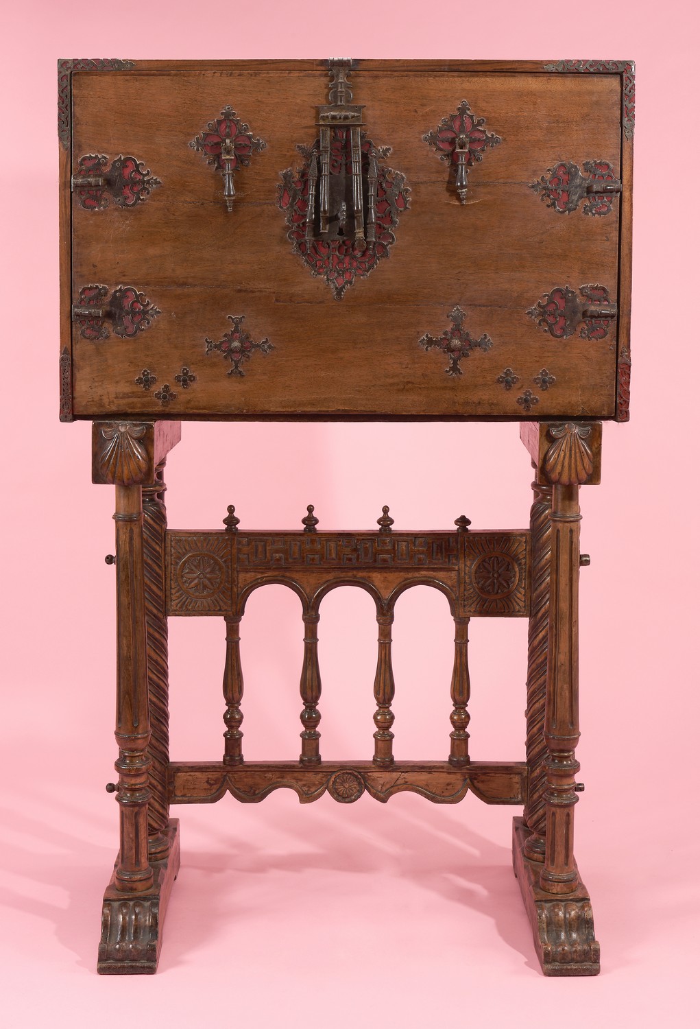 A SPANISH WALNUT VARGUENO ON STAND