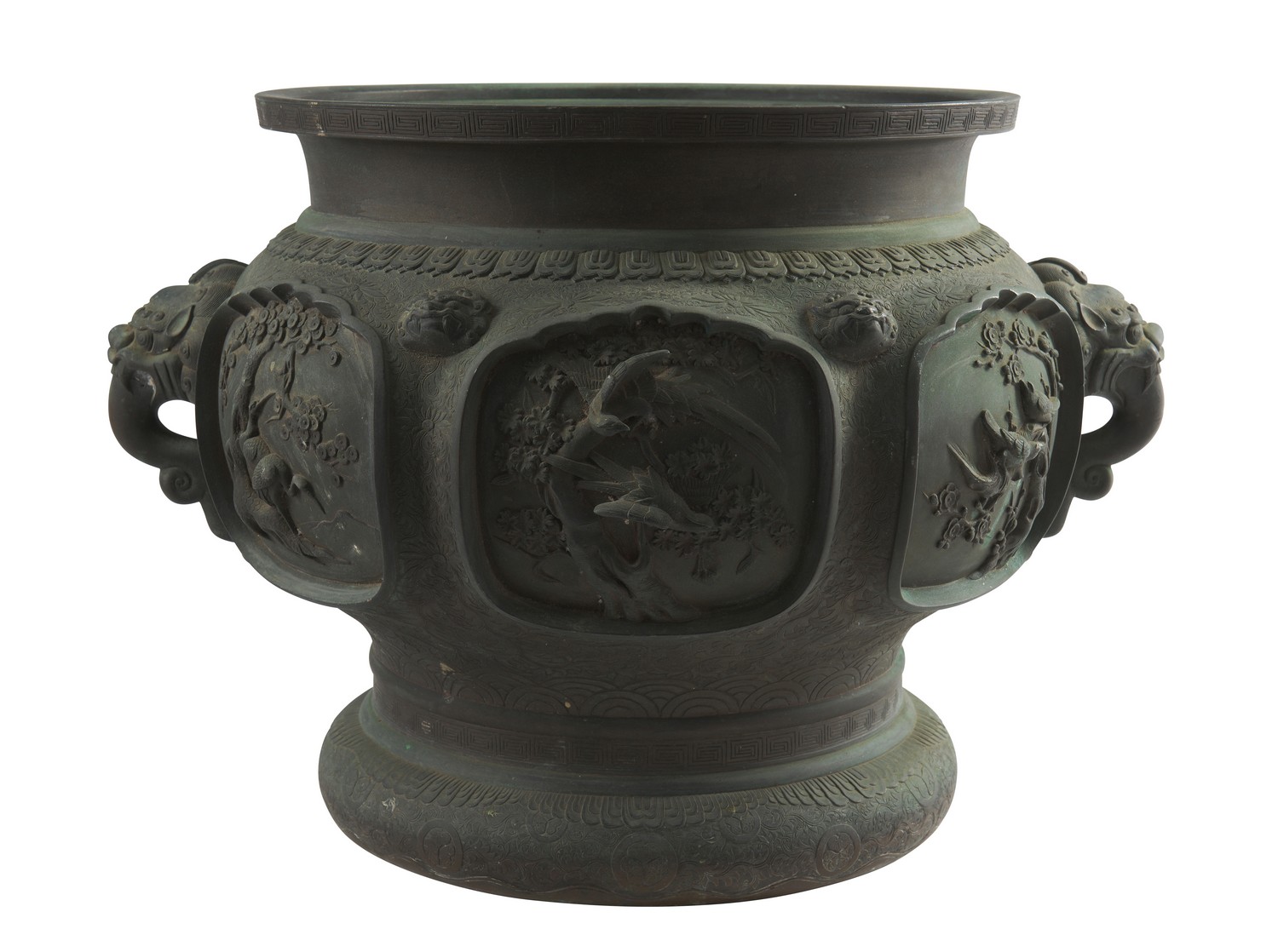 Of baluster form with twin mask handles, the sides decorated with shaped reserves containing bird and flower vignettes.