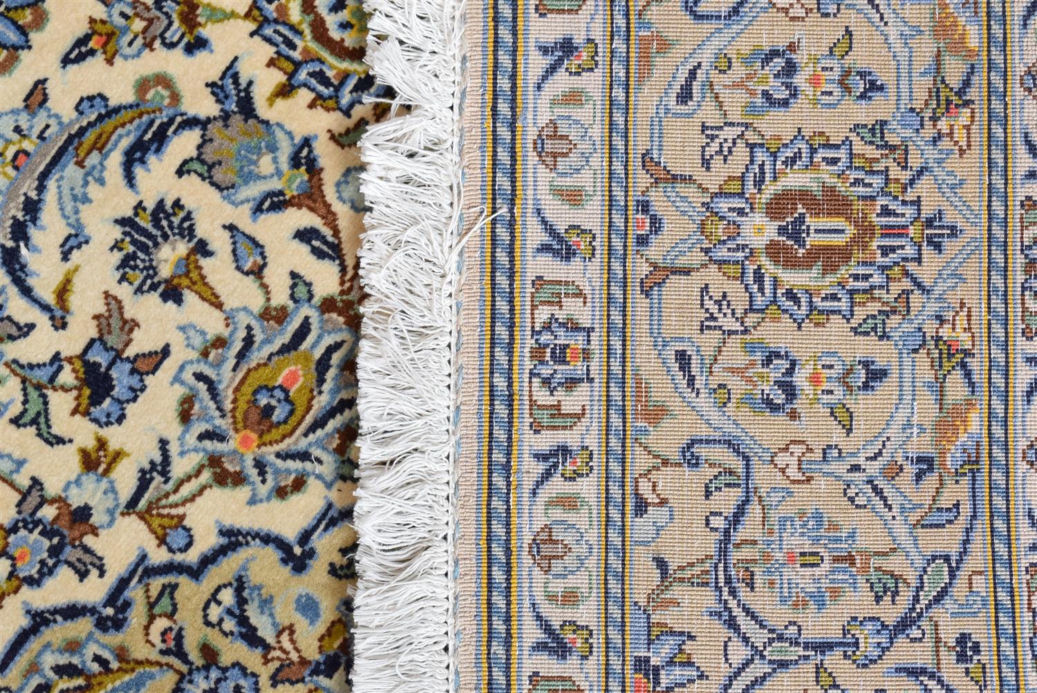 A COLLECTABLE AND SUPERFINE PERSIAN KASHAN CARPET, 100% LAMB'S WOOL PILE IN PRISTINE CONDITION, FINELY HAND KNOTTED SHADSAR ATELIER WEAVE OF 500,000 KNOTS PER SQUARE METRE, CLASSIC KASHAN BOOK COVER DESIGN OF CHANDELIER SHAPED MEDALLION AND QUARTERED CORNER MEDALLIONS IN A CREAM FIELD OF 17TH CENTURY SHAH ABBASSI PALMETTES, BLOSSOMING FLORAL SPRAYS AND TENDRILS, BORDER OF PALMETTES AND TENDRILS, SIZE 230 X 145 CM, ORIGIN IRAN, RRP $5,600