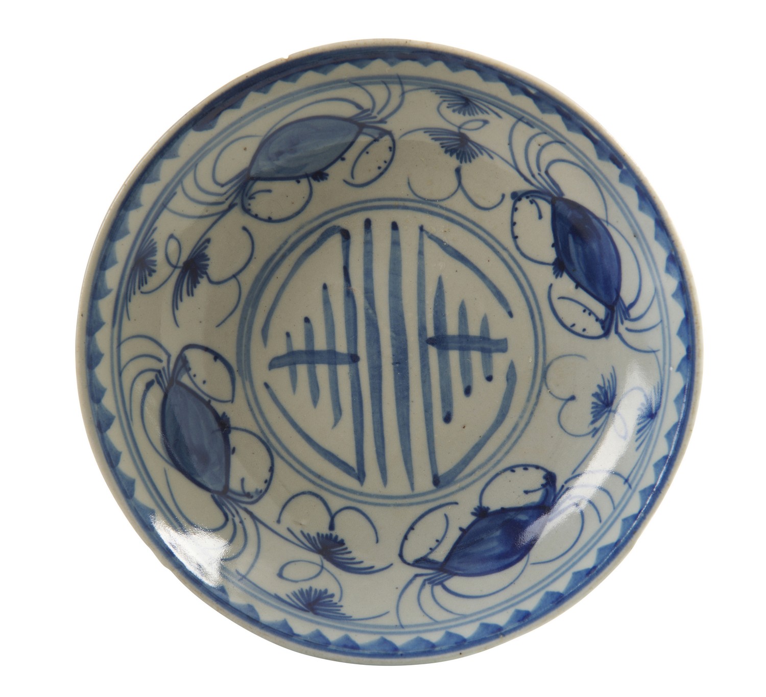Comprising two blue and white bowls decorated with floral and landscape motifs, a dish with a 'shou' character and a small round covered box.