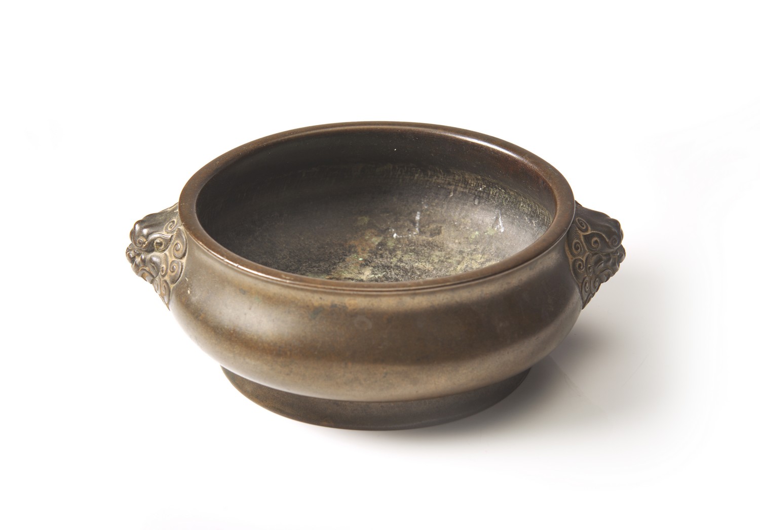 Finely cast in bombe-form with lion mask handles and an eight character mark in relief in seal script inset to the base, translating as "Han home collection. Chongzhen Ixi."